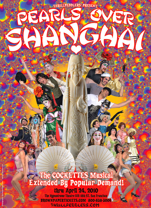 To mark the 40th anniversary of the formation of this truly groundbreaking bunch, local San Francisco theater company “Thrillpeddlers” has remounted “Pearls Over Shanghai”. Originally debuting on New Year’s Eve 1970, this revival opened in June of 2009 and has played continually to packed houses since. Hailed as “a mind-blowing extravaganza inspired by the mythos of sin-soaked Old Shanghai and classic Busby Berkley production numbers”, book and lyrics are by Link Martin, with music by ‘founding Cockette member’ Richard “Scrumbley” Koldewyn. Together the duo has created 24 original songs that keep their cast of 20, singing, dancing, emoting, to the enthusiastic applause of crowds week after week!