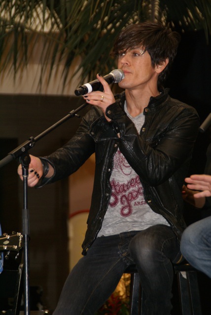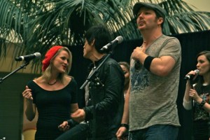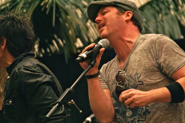 Sean Jenness, who understudies “Lonnie” (“Rock Of Age’s” wise-cracking narrator) served as M.C. for the afternoon, joined by cast members including Mig Ayesa–former contender for lead singer of INXS on the popular reality contest “Rock Star”. Ayesa plays “Stacy Jaxx” lead singer of the fictional “Hair Band“ “Arsenal”, and kicked things off with a blended rendition of Bon Jovi‘s classic “Dead Or Alive” (a song that not coincidentally, introduces his character in the show,) then, backed by a powerhouse of voices supplied by the rest of the cast, expertly segued into ’Mr. Big’s” “To Be With You”. Immediately following, the ladies took charge and shook the house, as Rebecca Faulkner, the show’s Lollapalooza of a leading lady, who stars as the vivacious Sherrie (–a dreamy-eyed girl from the Midwest who goes ‘motorin’ to Hollywood searching for stardom and finds true love,) joined Teresa Stanley–herself the unadulterated vocal equivalent to a super nova in the role of Justice, the Proprietress of the local “Gentlemen’s Club”; together, they dazzled the audience with the rock-ballad “Every Rose Has Its Thorn”. Suffice it to say, “Have these gal got the pipes!“ Not to be easily outdone though, Ayesa and Jenness returned to harmonize an incredible ’acoustic” version of ’Extreme’s” haunting “More Than Words”.