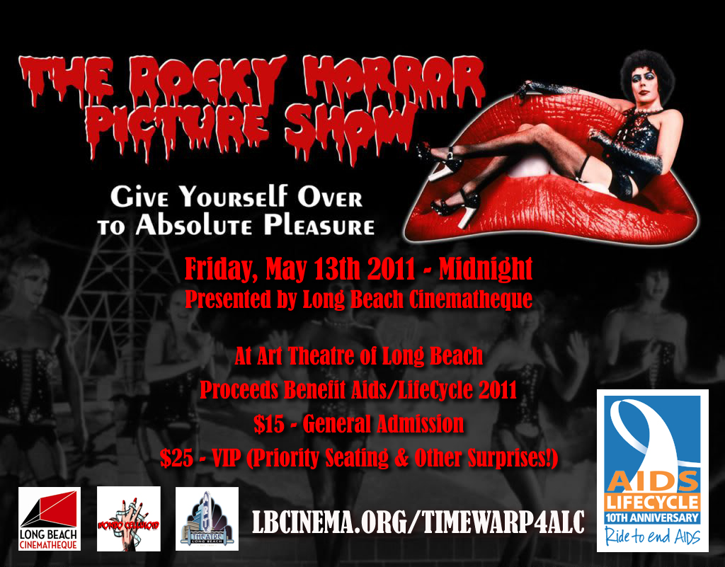Sometimes, the devotion certain movies inspire can even become a source of support for a terrific cause. On Friday, May 13th , die-hard fans can look forward to “doing the time warp” all over again when the Long Beach Cinematheque will hold a benefit ‘Shadow-cast’ screening of “The Rocky Horror Picture Show”–complete with a live cast. That evening, The Art Theatre, located at 2025 E. 4th Street in Long Beach, CA., is the place to be. Not too long ago, “The Art” was considered one of the few places remaining where true aficionados could go every Saturday Night and see “Rocky Horror” the way it should be–through props and with a dedicated troupe of performers acting out the story along with those on-screen. Proceeds for this for one-night-only event will go to support AIDS Lifecycle, with festivities slated to begin at 11:15 pm. General Admission is $15.00; VIP Priority Seating is also available for $25.00, which offers special seating in the first few rows of the theatre, guaranteeing some “absolute pleasure” up close! In addition, EVERYONE will receive a special “Goodie Bag” filled with all the supplies that, as any expert will tell you, are absolutely needed for maximum enjoyment (–like a mini water gun, toilet-paper, and other terrific surprises!) For more information, checkout: http://lbcinema.org/timewarp4alc .