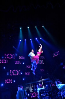 There’s also a breath-taking dream ballet between Tunny and “The Extraordinary Girl” (Nicci Claspell,) an army nurse with whom he will fall in love, staged as a stunning and surreal pas-de-deux in mid-air with both suspended high above the stage! The last scene, when the three friends reunite as virtual strangers, and attempt to reconcile with whom each one is now after all they’ve been through apart, is apt to leave one with feelings more of uneasiness rather than full closure; however, in yet another departure from convention, the actual ‘finale’ occurs after the curtain call, when the cast, having already taken their bows reassembles, guitars in hand, and serenades the audience with “The Time Of Your Life”. Here at last is where the production’s ultimate message is delivered: “So make the best of this test and don’t ask why, it’s not a question but a lesson learned in time –It’s something unpredictable but in the end-it’s right.”