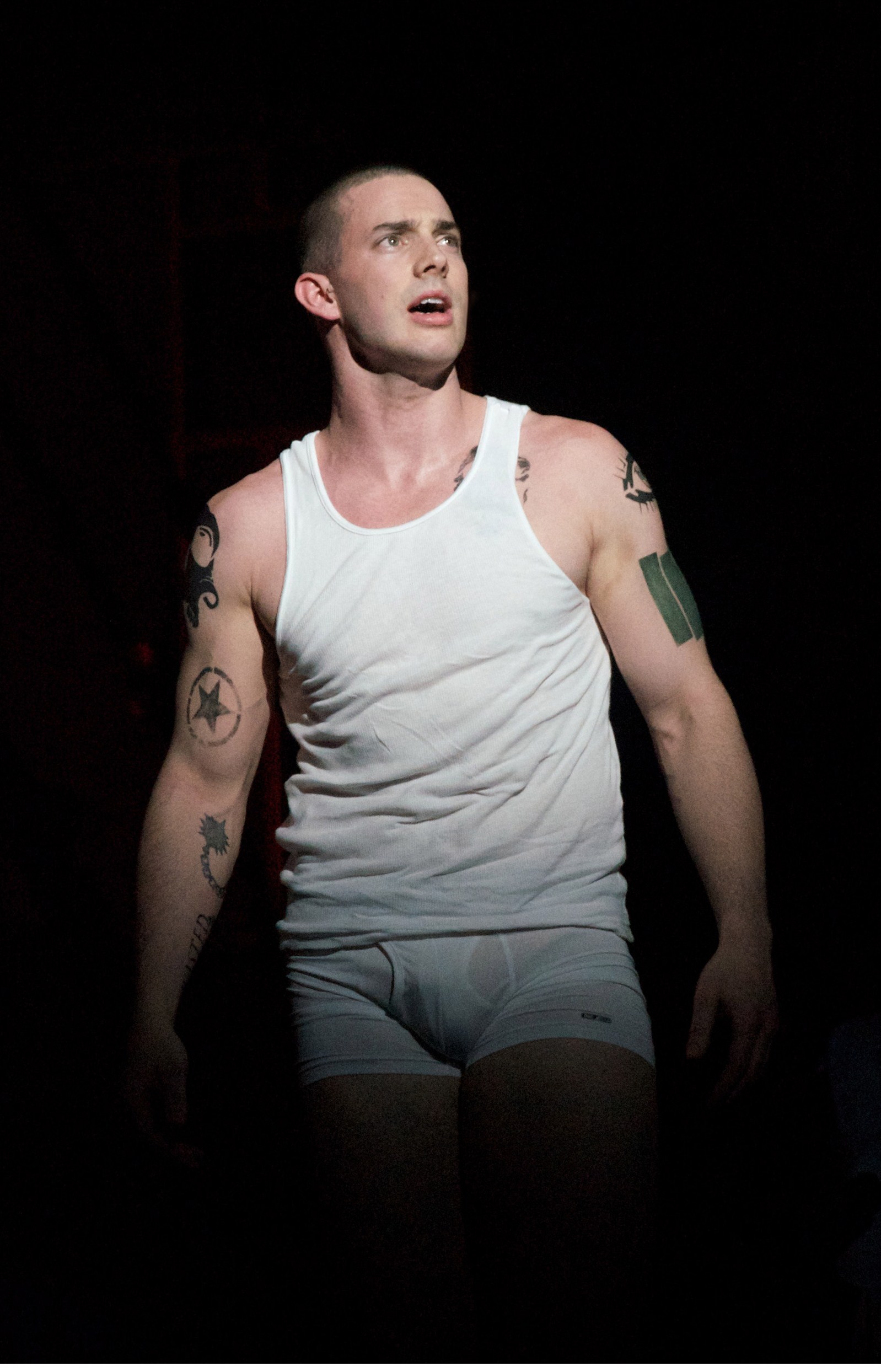Interspersed are some of the best, most evocative songs ever heard in a rock musical–among them, “Boulevard of Broken Dreams“, “21 Guns“, and of course, the rousing title number. Armstrong’s uncanny ability to find just the right word to describe or touch the right emotion easily ranks him among such other esteemed rock-poets as Jim Morrison or Bob Dylan. (Look extra close and you’ll see that several in the ensemble are done-up to look like him and band-mates Mike Dirnt and Tre Cool.) Here, such dynamic lyrics benefit beautifully with their added staging.