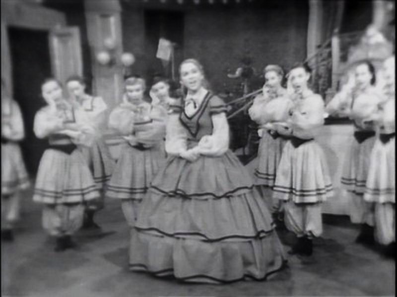 Originally airing as part of NBC’s popular “Producer’s Showcase”, this slightly streamlined-for-television version in many ways actually improves on its source material. Based on an unpublished play by Dan and Lilith James, the book by Sig Herzig and Fred Saidy, (adapted for television by Leslie Stevens) is witty and sometimes eerily cogent to today’s headlines. (For instance, Evelina’s father fumes at one point “That ‘rail-splitter’ in the White House has saddled us with a National Debt of Six Million!” to which his wife replies, “Mrs. Lincoln must be an extravagant housekeeper!”)It’s also interesting to consider that the ‘play-within-a-play’ production of “Uncle Tom’s Cabin” predates Rogers & Hammerstein’s similar use of the material for their “King And I” by seven years when “Bloomer Girl” first bowed in 1944.