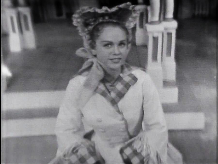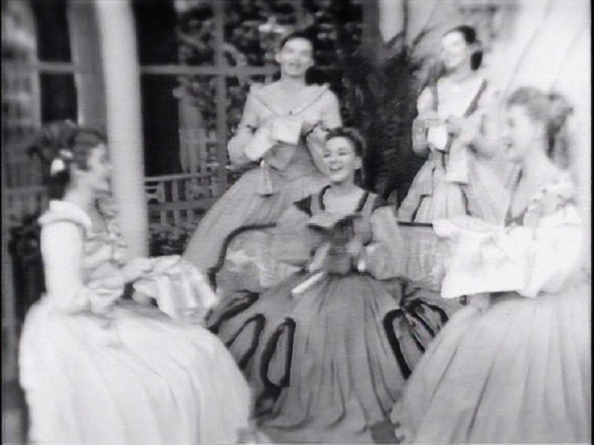 Her observation is right on the money—seldom has a “Musical Comedy’ dared to incorporate such serious and potentially controversial subjects like civil rights, feminism, and anti-war sentiments as this does. Moreover, Alex Segal’s Direction sometimes borders on remarkable—particularly given the technical state of 1950’s television and the run-time limitations. Segal employs some sophisticated camera and staging techniques including a second act “Carriage Ride” the two principals take and the near continuous motion involved with the “Sunday In Cicero Falls” number. For this TV Production, famed choreographer Agnes De Mille was brought in to recreate several of her dances from the original Broadway version—including the dynamic “Civil War Ballet” assembling the original four principal dancers to similarly re-enact their roles in this, which ranks among the most affecting of the entire spectacle.