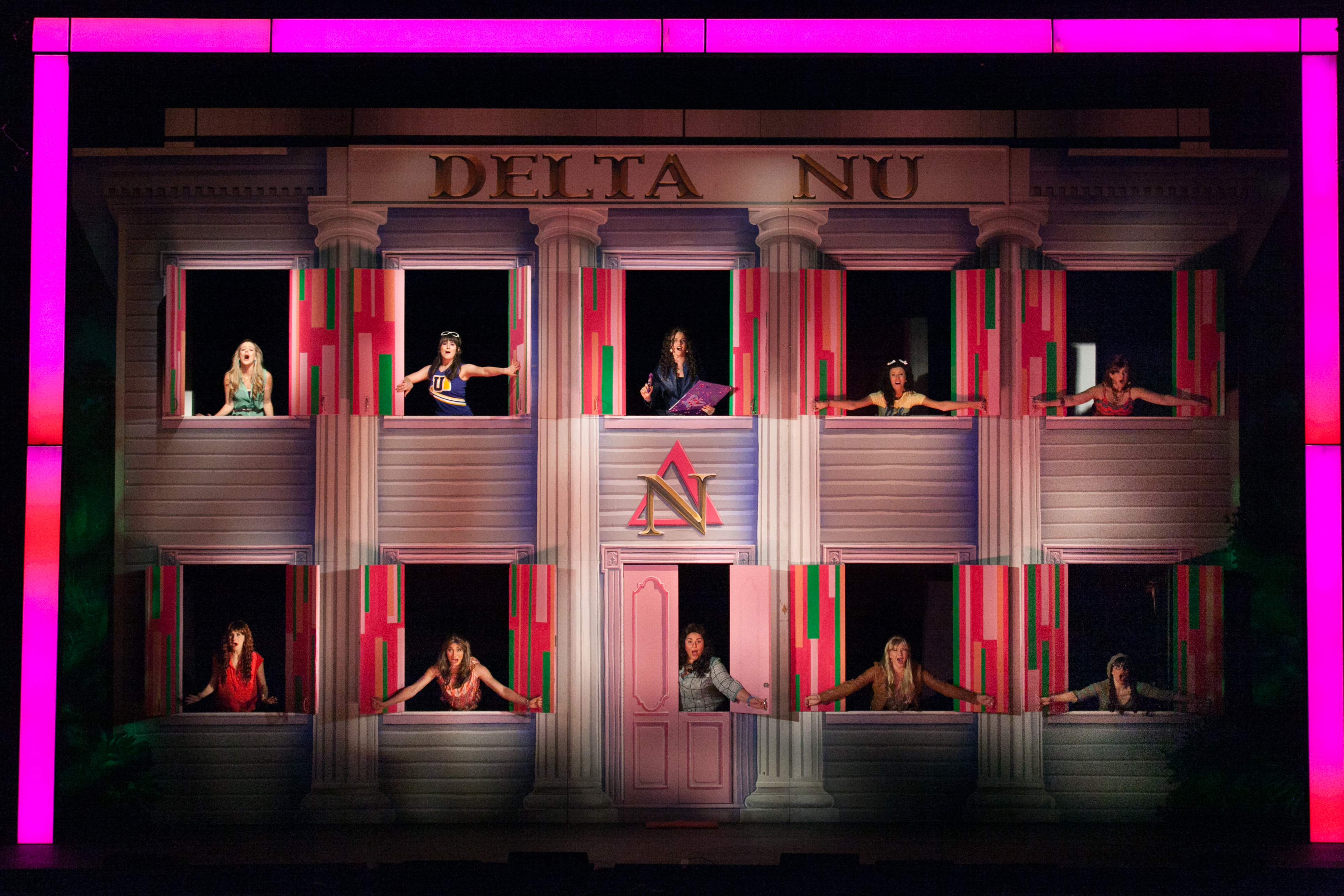 Joining them all are Elle’s trio of Sorority Sisters, Margot, Pilar and Serena (played by Jamison Lingle, Tory Trowbridge and Micaela Martinez, respectively.) Even when they are not supposed to be with her physically, these loyal lasses of “Delta Nu” remain her guides “in spirit”, acting as an inner-conscience for her, Greek Chorus for us. (Dressed in ethereal white when they serve this former function, one advises her, “We’re not HERE here, we’re here in your head.”) Supporting everything is a cast of 27 performers (including the four-legged one) who particularly make the goings-on more jubilant during the many, often hilarious, group numbers.