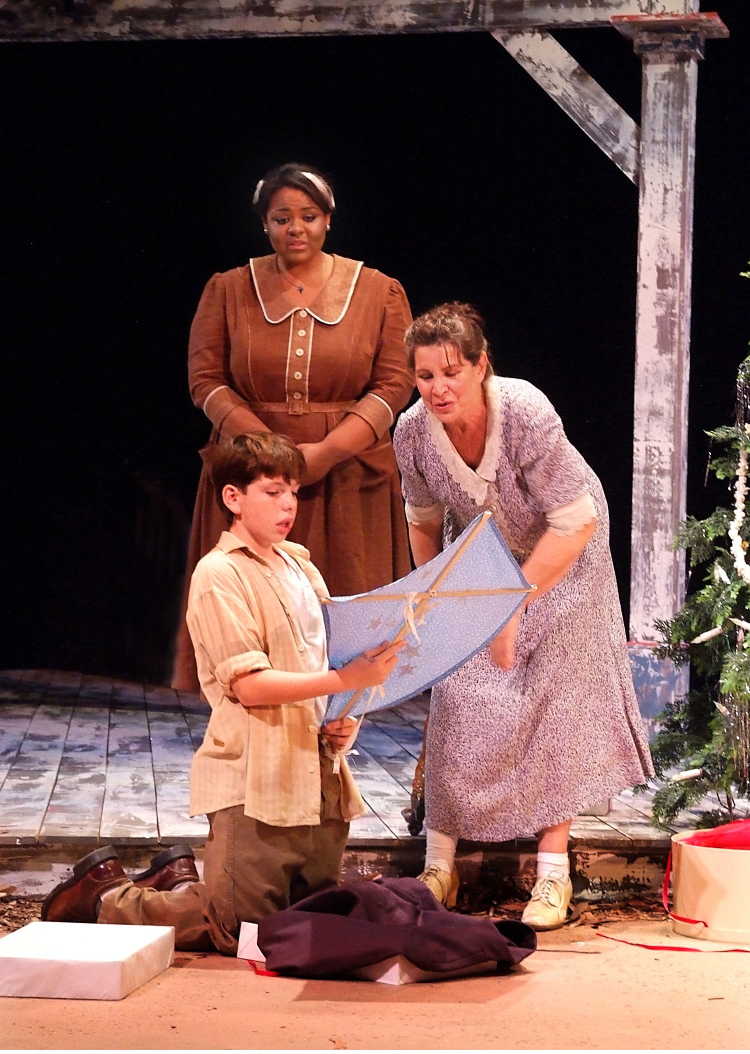Featuring two participants in The Laguna Playhouse’s “Youth Theater Repertory” program, the cast of seven form a surprisingly strong ensemble. As the older Buddy from whose viewpoint everything is seen, Ciaran McCarthy is onstage just about every moment, as memory and the present exist side by side thanks to De Gruccio’s often inspired staging. “Yesterday was simple, easy and clear” Buddy–the man, recalls upon returning to the house he shared for a time with his cousins. Now a successful author, he’s burdened by the hurly-burley of big city life and the stresses success can bring (“when you’re only as good as your last effort.”) McCarthy most notably hits pay-dirt with his numbers “Imagine A Morning” and the act one closer, “Paper and Cotton”, and while he has a voice more than big enough to fill the Laguna Playhouse’s ample 420 seat auditorium, it’s the quieter, more concentrated moments when he really shines, such as in the show’s poignant finale. Likewise, Marsha Waterbury is delightful as Sook—the good-hearted child-woman Buddy so depends on for his emotional connection to the world. Immediately she provides the sense that here is someone who not only needs protecting, but deserves it as well. Tracy Lore is Jennie, her stern oldest sister who, we learn in her second act solo “You Don’t Know It”, gave up any chance of personal happiness to look after her younger siblings, with the result being the development of a sharp ‘edge’ to her slightly damaged psyche. Her greatest fear for Buddy is that he’ll grow up ‘soft” which doesn’t play well in a ‘hard world’. At its center though, young William Spangler is particularly engaging throughout as the younger Buddy. His best moments (and there are numerous) include “Alabama Fruitcake”, “One Small Seed” and the second act’s “No Tellin’”.