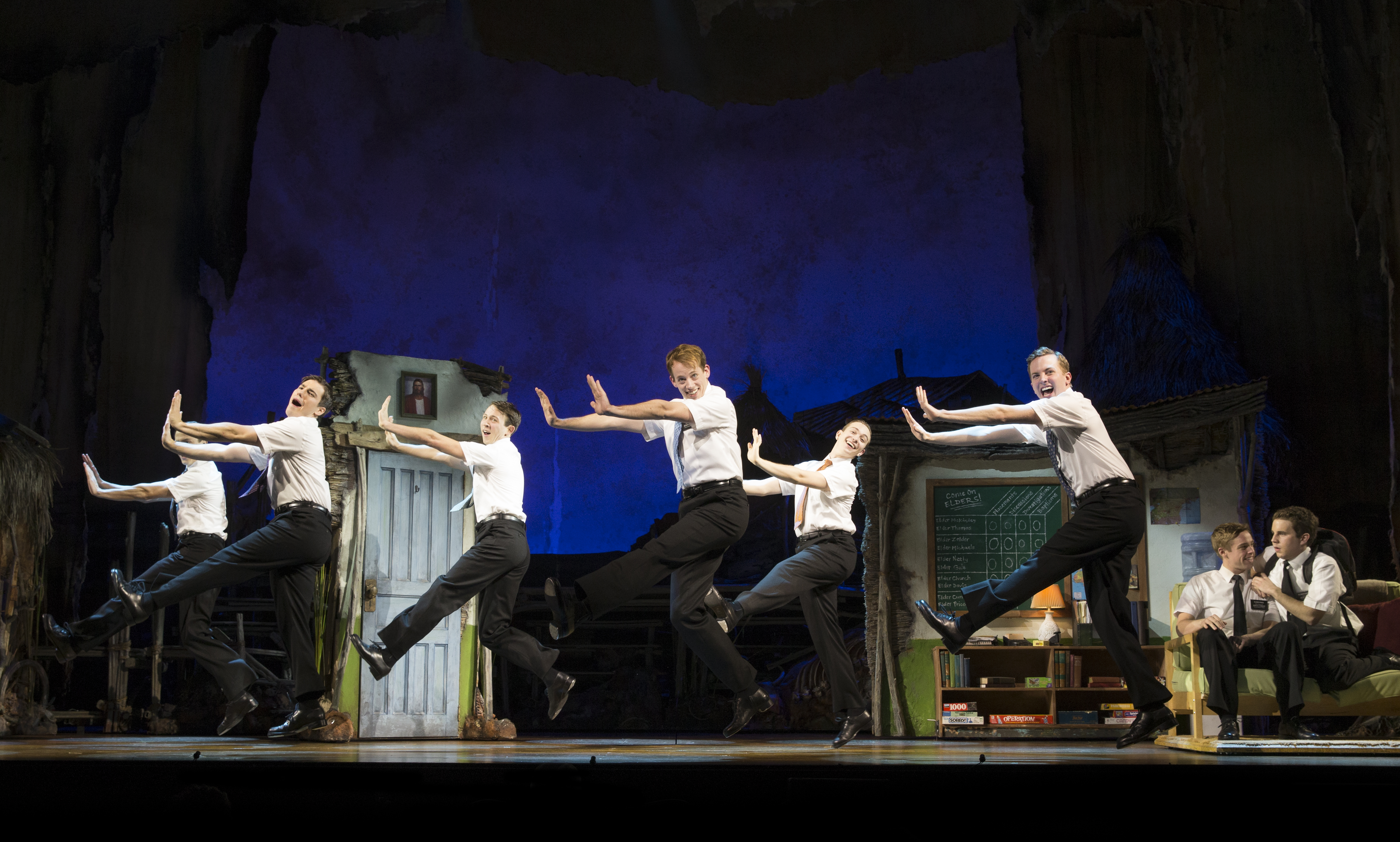 As Elder Kevin Price, David Larsen is as wholesome as a tall glass of milk, gifted with an especially expressive voice. He effectively takes center stage in most of the group numbers, but his solo effort, “I Believe” is a definite crowd pleaser, as is “You And Me—But Mostly Me”. So too, Elder Price’s “Spooky Mormon Hell Dream” is raucously hilarious as he envisions every young red-blooded Mormons’ worst fears in the place of eternal fire. Denee Benton too, is spot-on as the innocent, wide-eyed and waifish, “Nabalungi”–the idealistic African girl caught in some pretty severe circumstances. Among her best and surprisingly touching moments occurs with her number, “Sal-Talay-Ka-See-Tee” (Salt Lake City) wherein she dreams of better days for herself and those she loves by imagining a near impossible Utopia where “flies don’t bite your eye-balls and human life has worth.” Meanwhile Pierce Cassedy’s Elder McKinley is the most, well, let’s say ‘overtly ebullient’ ward-leader this side of the “Evergreen Conversion Therapy” ministry (“O.M. Gosh!” he exclaims upon hearing of Elders Price and Cunningham’s eventual successes with the villagers.) His big number is “Turn It off” in which he enthusiastically instructs the ward to literally tap their troubles away by repressing–via song and dance—any unwanted thoughts or emotions.