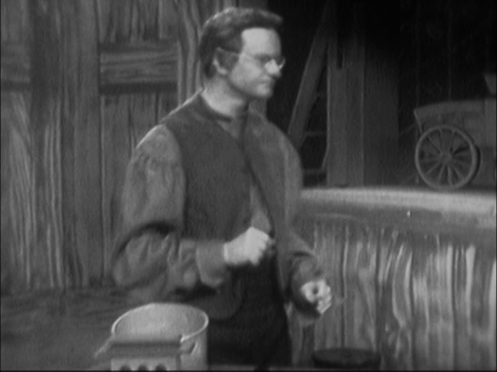 Leading a thoroughly likable, A-Plus cast, is Jeannie Carson in the title role. Reminiscent of a young Mia Farrow, she effectively inspires a near-instant sense of empathy from us, the viewers, which is distinctly important for the character she’s playing. In addition, Carson has a crisp and expressive voice which she puts to great use early on in “Pick Yourself A Star” ; later, her handling of the Act Two closer, “Pastures Of Your Home” ends the act forcefully but with a sense of hope (and both tunes similarly demonstrate Ms. Leigh’s often under-appreciated talent for a clever turn-of-phrase.) As her Grandfather, Broadway veteran Richard Eastham gets his chance to shine with “I Go My Way” wherein we learn how came to be a brusque, embittered man who remains suspicious of the outside world (“I go my way, even though I go my way alone!” he sings.) Eastham has a sumptuous baritone and he especially impresses with it here. His other solo, “Greener Pastures” is another awesome accomplishment, delivered as Grandfather desperately tries to console himself upon losing his now beloved grand-daughter: “You dream beyond some distant hill lies the answer to a dream you must fulfill…young and restless you are bound to roam until you’re old enough to know–there are NO pastures that are greener than the pastures of your home!”