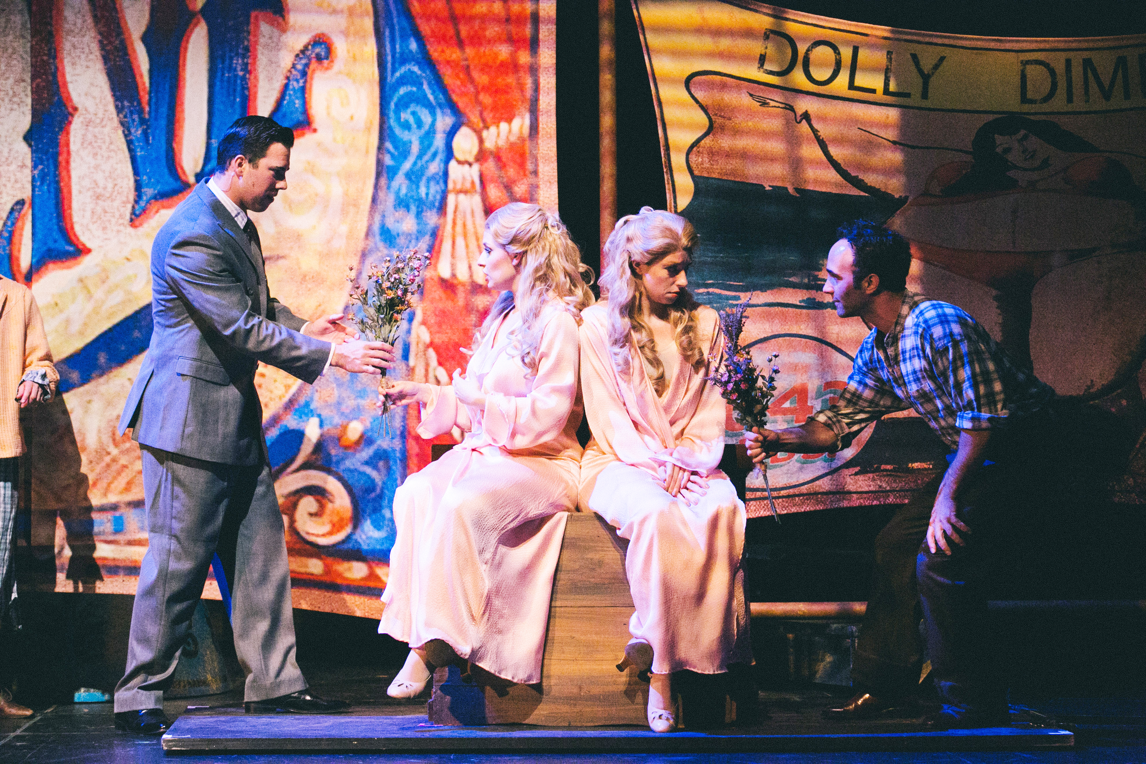 As “Buddy Foster”, the first to “discover’ them, Gary Brintz is likeable and exceptionally empathetic; however, although genial enough, we ultimately learn that he’s after his big “break” too! Gifted with a voice to be reckoned with, Brintz makes “More Than We Bargained For” a significant bit of fore-shadowing early on, before flourishing with the more playful “One Plus One Equals Three”. As his associate, “Terry Connor” —a talent scout for the famous “Orpheum Circuit” who initially undertakes to oversee the girls’ career, Gregg Hammer has a rich, full and expressive voice which he unveils to remarkable effect with his second act soliloquy “Private Conversation” as Terry dreams of the courage to express his deep affections for Daisy. Together, Dawson, Quast, Brintz and Hammer all do a striking job, first with “New Year’s Eve” during which Buddy finally proposes to Violet, then later with the surreal “Tunnel Of Love” as each of this admittedly unusual quartet ponder the romantic possibilities and complications facing them. Nathan Holland also offers up fine support in the dual role of the often seethingly vicious and conniving side-show “Boss” and later as Director “Todd Browning”. It is he who first greets the audience, striking just the right balance of tantalization and salaciousness with the opening wherein he introduces his curious assemblage.