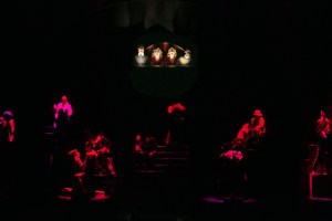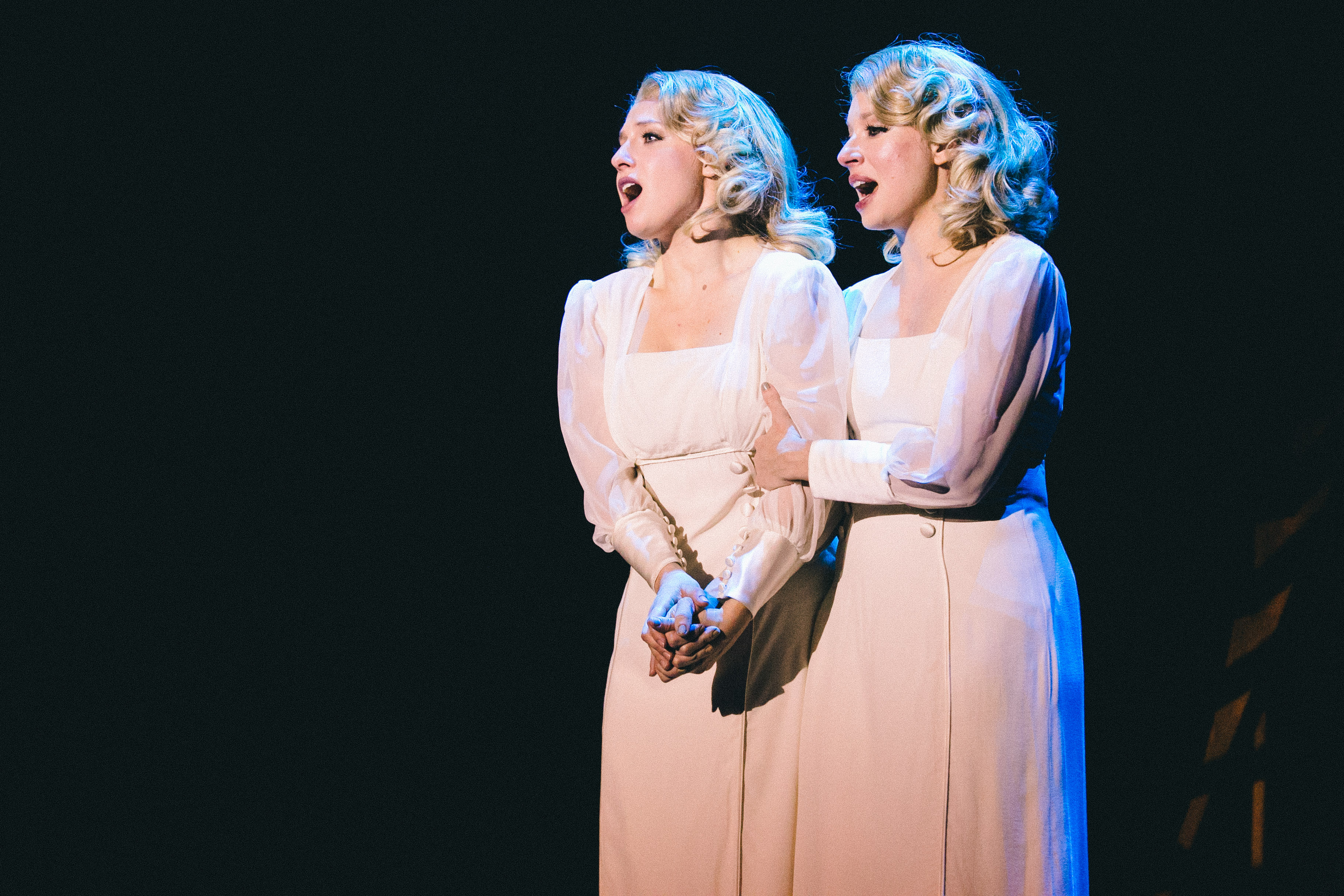 As the audience piles into the auditorium, one by one cast members similarly fill the bare bleachers on stage that are situated under strings of lights and a gilt-edged proscenium curtain. Performed sans either overture or entre’ act, house goes to half as the first wraith-like refrain is heard beckoning viewers to “Come look at the freaks…They’ll haunt you for weeks!” Even if, historically, one knows the ending will veer at best toward the bittersweet, we still remain hopeful right along with the sisters, every step of their journey; such is the strength of both Russell’s book and the performances of lead actresses Jeanette Dawson and Afton Quast. One thing’s for sure—they don’t write ‘em like this anymore!