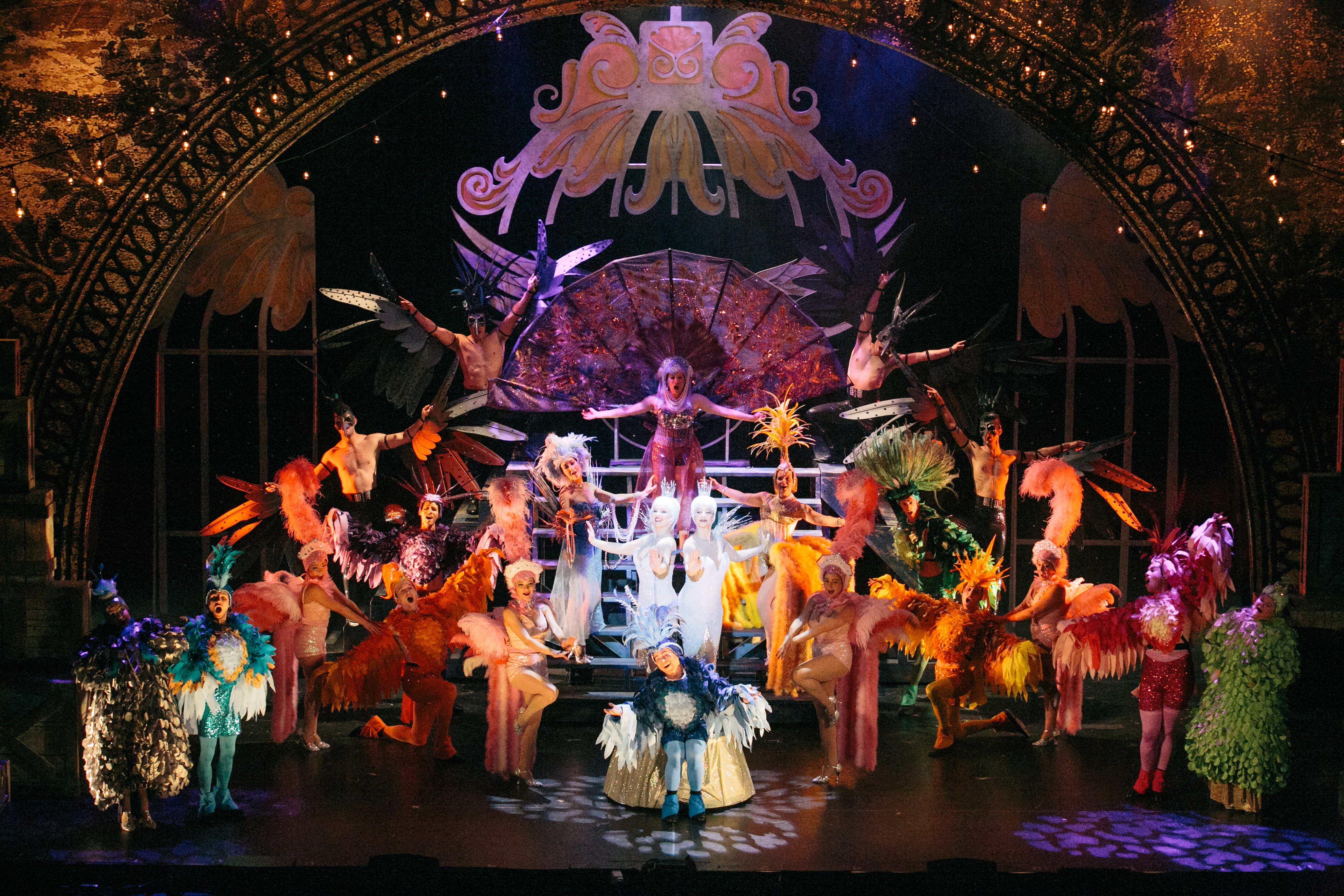 The production also features some terrific ensemble work, and the voices of each member are more than up to the score’s pithy requirements. Indeed, another of the show’s copious virtues is the way it sandwiches in some pretty heady sentimental moments between some genuinely soaring musical passages. In addition to the opening, the group succeed prodigiously with “The Devil You Know”, which steadily builds—starting as a solo first, then involving the entire company as they debate the wisdom of the twins leaving their side-show home to risk pursuing the (perhaps empty) promises of their new managers, Buddy and Terry. Shortly after, they also collectively amaze with the touching “Say Goodbye To The Freak-show”. Throughout, the various opulent “spectaculars” once the twins ‘hit the big time’ (featuring among other things, a line of dancing Egyptian chorus-boys or a flock of brightly colored “birds”) offer plenty of great opportunities for some terpsichorean grandeur.