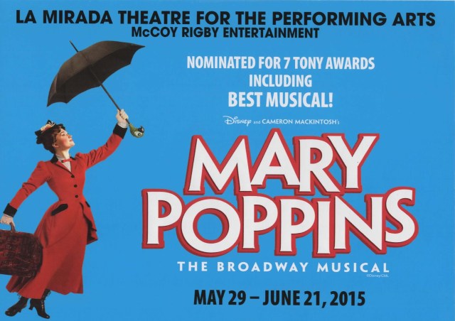 It’s a ‘Jolly Holiday” in La Mirada California, where “The La Mirada Theatre For The Performing Arts’ in association with Mc Coy-Rigby Entertainment are offering the final production of their acclaimed 2014-2015 season–the ebullient “Mary Poppins”! Based on an inspired blending of the time-honored stories by P.L. Travers and the iconic film by Walt Disney Productions, this often mesmerizing theatrical achievement certainly puts the “Super” in “Supercalifragilisticexpialidocious”! Adapted for the stage by Julian Fellowes, it features the unforgettable songs by brothers Richard M. Sherman and Robert B. Sherman, with several new ones (and additional music) by George Stiles and Anthony Drewe. With these more recent pieces flowing seamlessly from the older ones, rest assured that this “Mary” features most all of the best-loved refrains from the movie’s Academy Award-winning score, including: “Step In Time”, “A Spoonful Of Sugar”, “Let’s Go Fly A Kite”, and the sumptuous “Feed The Birds” (–said to be Walt Disney’s personal favourite among all the songs from his various cinematic outings) in addition to several remarkable new numbers which provide the story with plenty of unexpected melodic marvels!