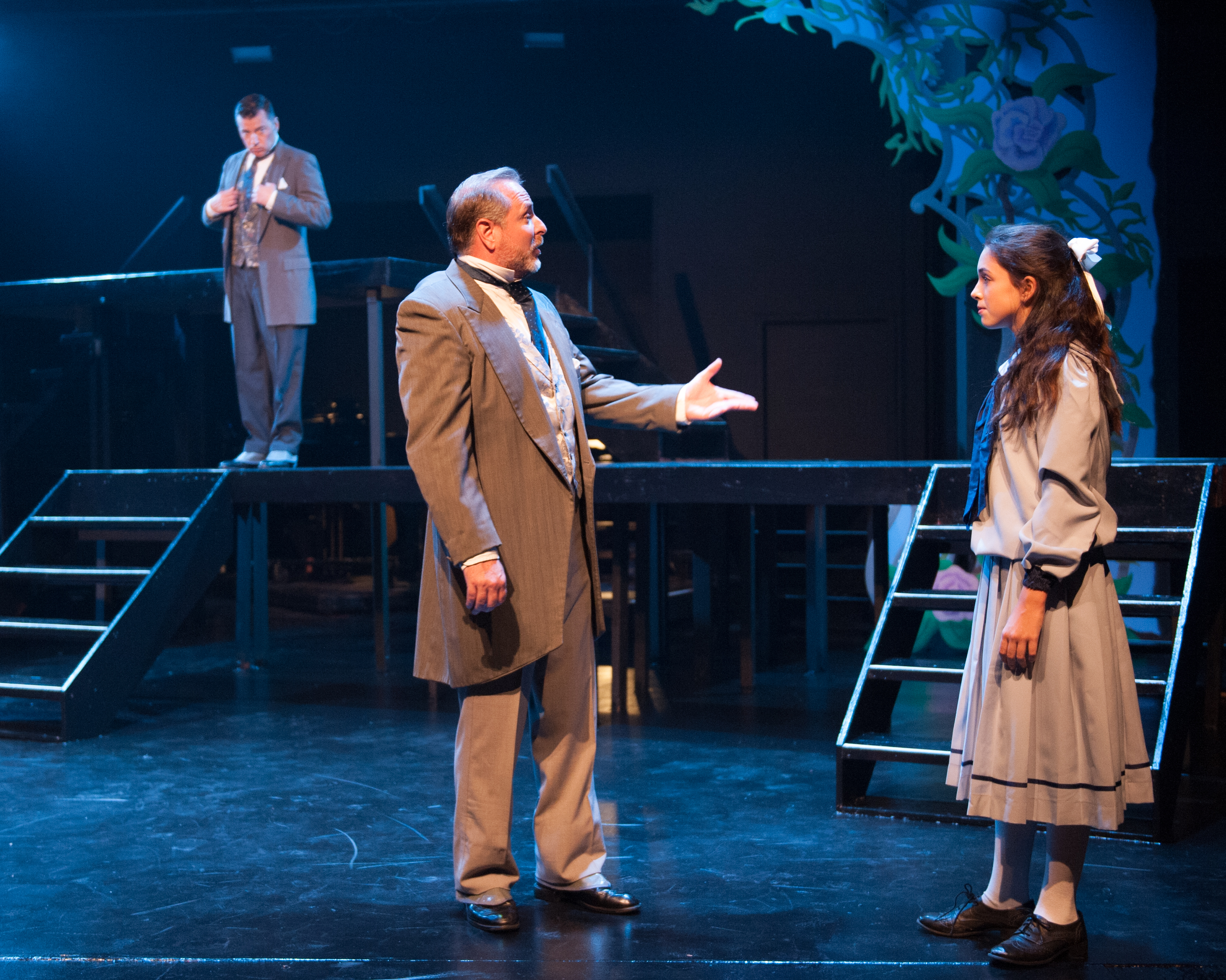 “She needs a home–the only thing she really needs I cannot give. Instead she asks a bit of earth, to make it live!” Duane Thomas as “Uncle Archibald” meets Sophia Scarsi as his niece “Mary” while Chris Peduzzi as his brother “Neville” looks on.