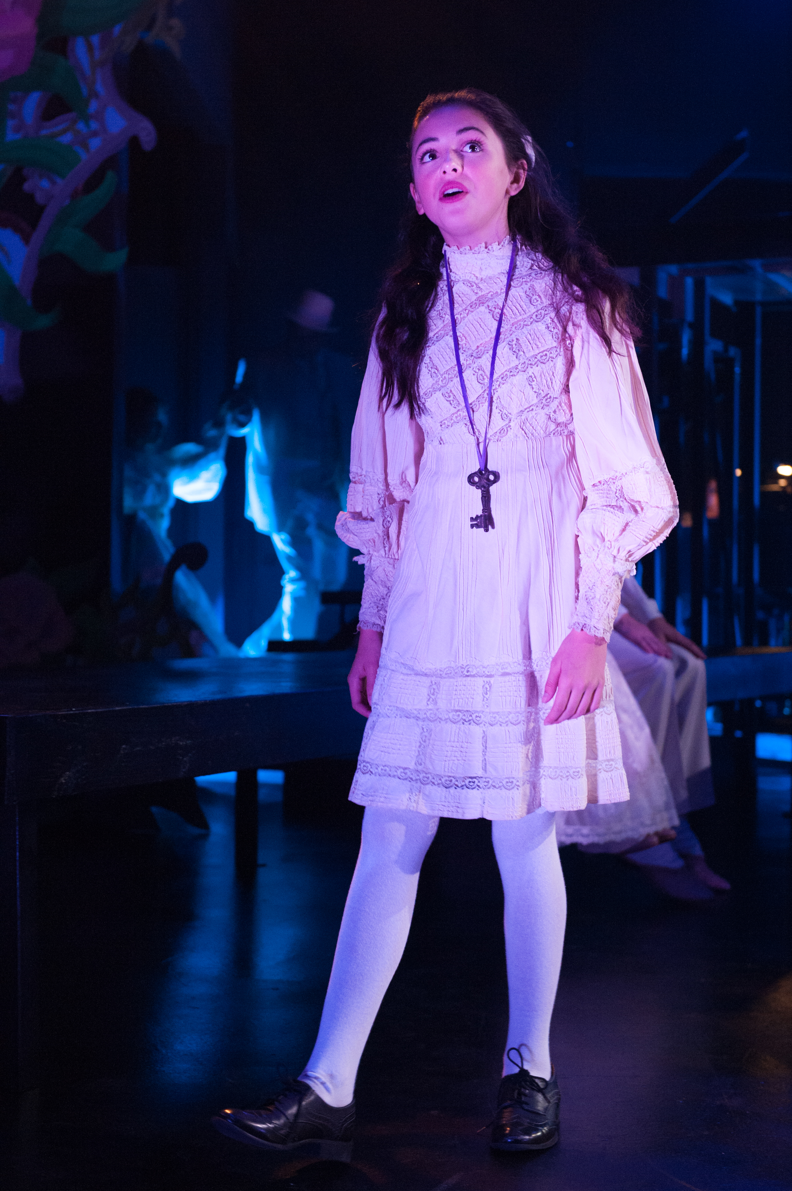 As Mary’s Uncle “Archibald Craven” and her only living relative, Duane Thomas gives us a man who isn’t so much cold or even neglectful, but rather one who is emotionally pained and conflicted. (“Does everyone who dies become a ghost?” Mary asks her uncle; “They’re only a ghost if someone alive is still holding on to them” he replies.) His opening act soliloquy “A Bit Of Earth” is absolutely sensational–and what a voice he too, possesses! His second act refrain “Race You To The Top Of The Morning” is brilliantly gallantly delivered—incredibly sung, but never sacrificing the potent heart-rending sentiment underneath, as Archibald dares himself to dream of better days for his ailing child. Furthermore, Chris Peduzzi is himself superb as his brother, “Dr. Neville Craven”, the one who is assigned to Colin’s care (and who, we learn, had surreptitiously loved and wanted Lily for himself.) Similarly gifted with an operatic voice, he makes for the perfect villain (whether or not he’ll admit his motivations include gaining Misselthwaite for his own!) Peduzzi strikes just the right balance between strict and menacing, which is in keeping with the overall tone of the piece. He also quickly substantiates how rich and formidable a voice he also has, in numerous musical moments interspersed all through the show; but together, Thomas and Peduzzi dazzle with their dual declamations “Lily’s Eyes”—making for a symbiotic pair of bona-fide knockout performances! Moreover, Erika Baldwin as the omnipresent spirit of “Lily Craven” is nothing short of astounding. With a magnificent voice captivating enough to merit an ovation all its own, she manages to impress starting with the show’s very first lines (“Clusters of Crocus, purple and gold; blankets of Pansies, up from the cold. Lilies and Iris safe from the chill—safe in my garden, Snowdrops so still”;) then subsequently in an early “flash back” titled “A Girl In The Valley”, recalling Lily and Archie’s courtship. In the second act, her aria “Come To My Garden” is a deeply affecting duet with her son “Colin” and ranks as one of the very best and most stirring songs written for a musical…well, ever! Not to be overlooked either is her expert handling with Thomas of the reprise of “A Bit Of Earth” as well as their tender final duet, “How Could I Ever Know”.
