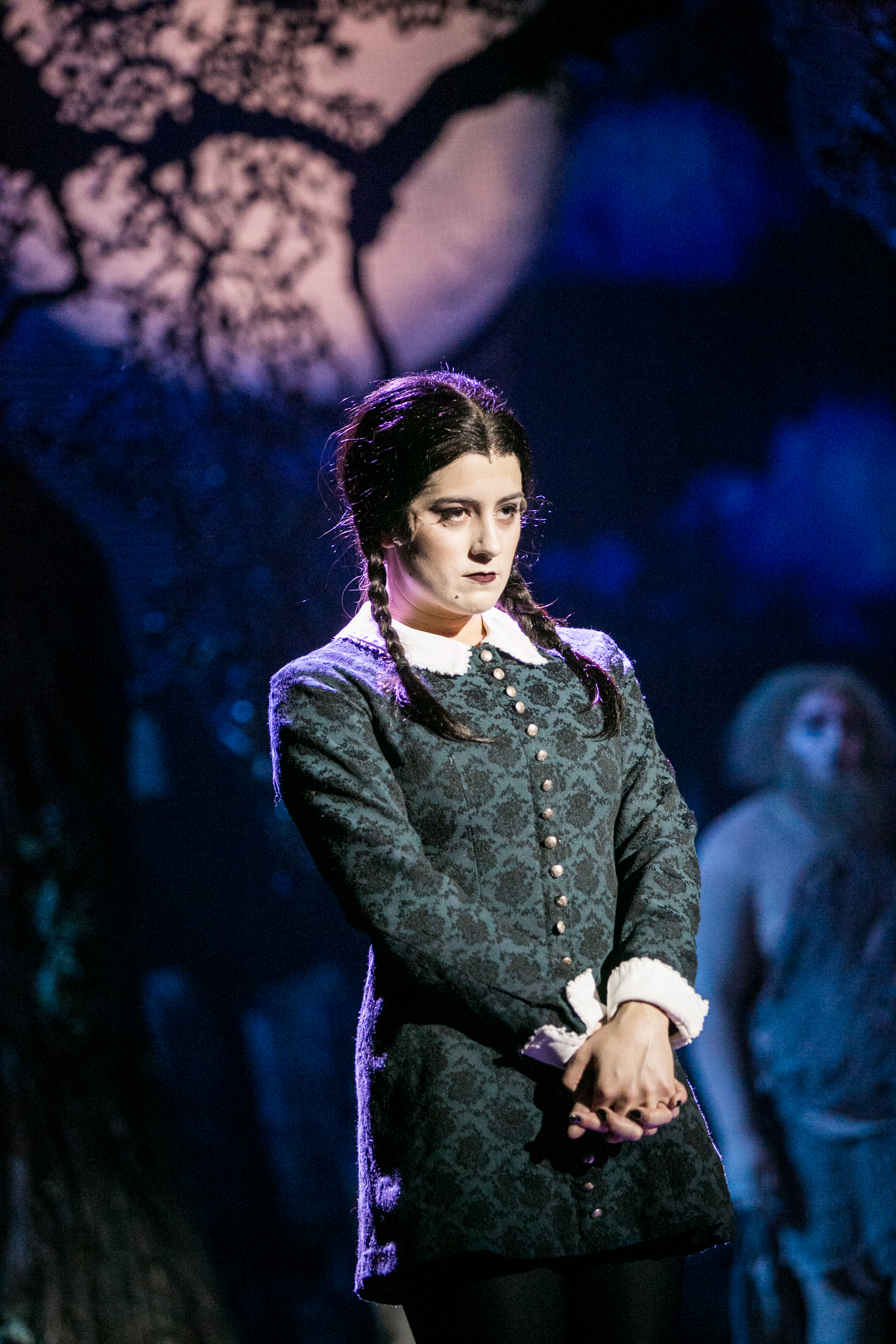 A genuine sense of awe pervades the theater as the gothic red-velvet curtains rise to reveal the titular tribe in a mist-shrouded cemetery calling forth the ghosts of their dearly-departed ancestors with “When You’re An Addams” (complete with the appropriate ‘snapping fingers’) making for an opening number to beat ALL opening numbers. Trick is, after summoning them all “Fester” fixes it so they cannot return to the great beyond until all is right with the family in terms of everyone’s matters of the heart. He may be onto something because we soon learn that when you are an “Addams” life is anything but a snap—particularly for Papa Gomez who’s faced with a problem daunting enough to cut him to the bone (–more than usual, that is!) Having just turned eighteen, his “little princess of darkness”, “Wednesday” announces that she’s fallen in love with a boy named “Lucas Beineke” and that they plan to marry; however until she can break it to the rest of the relatives (especially her mother, “Morticia”) she urges him to keep the news just between them. This means Gomez will have to do something he’s never done before—keep a secret from his beloved wife! Add to it, Wednesday asks that they have Lucas and his parents, “Alice” and “Mal” (–who aren’t exactly the “Brady Bunch” themselves) over for “one normal night” of dinner and family togetherness (“Normal is an illusion Darling,” Morticia reminds her daughter “…what’s normal for the spider is a calamity for the fly!”) If that’s not bizarre enough for them, Fester himself makes it known that he too, is deeply in love—having fallen head over heels with “The MOON” (–yes, that same large Orb that circles the Earth!) This time around, young “Pugsley” (largely overlooked in the big-screen versions) also plays an integral part in all the goings-on when, fearing he’ll miss the way his older sister tortures him (–literally), he tries to disrupt the wedding plans to hilariously unanticipated results! In fact, this is perhaps the only depiction of the infamous family where most all the relationships are explored (–even that terminally furry little crowd-pleaser, “Cousin It” puts in a quick appearance!)