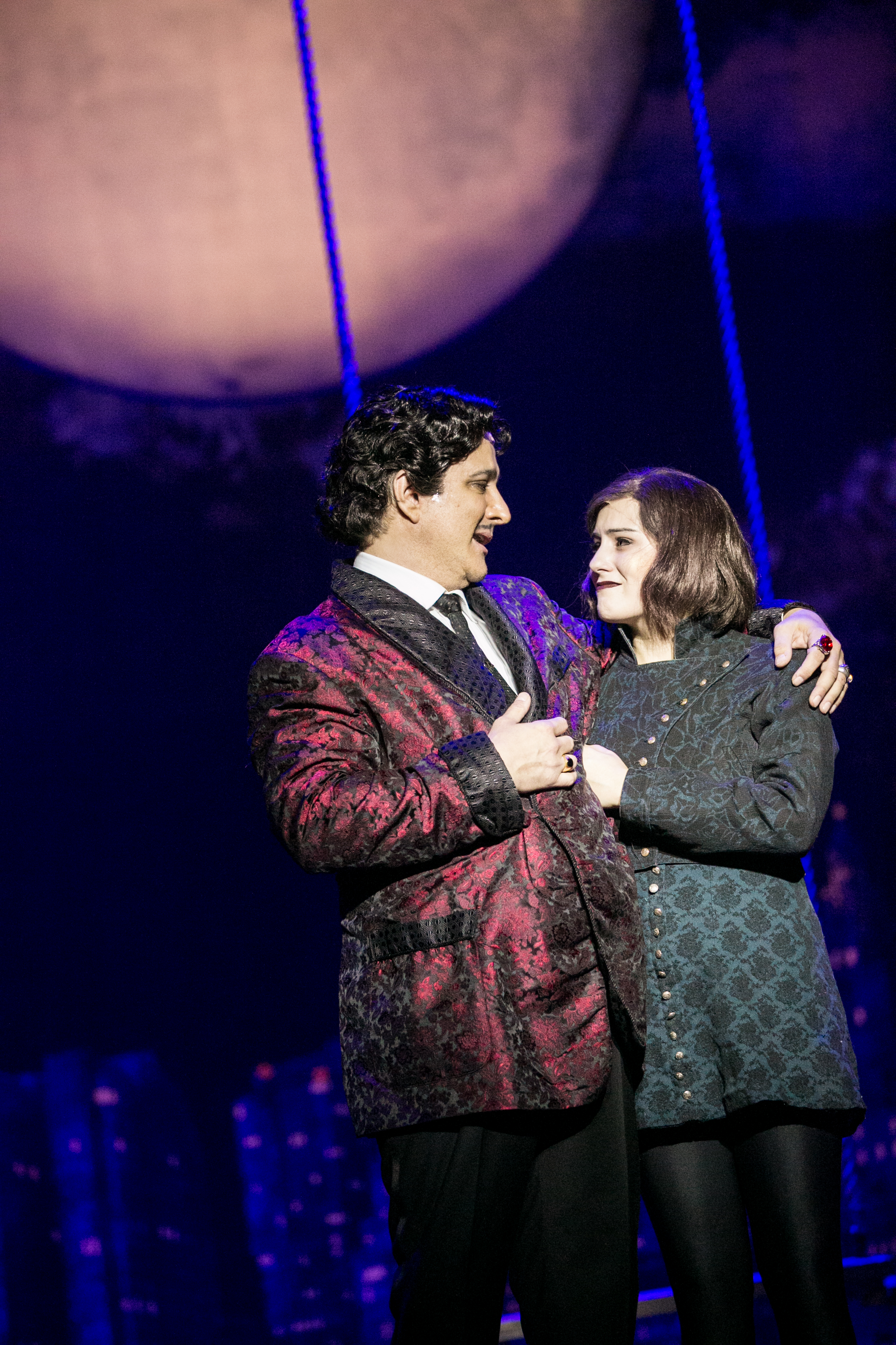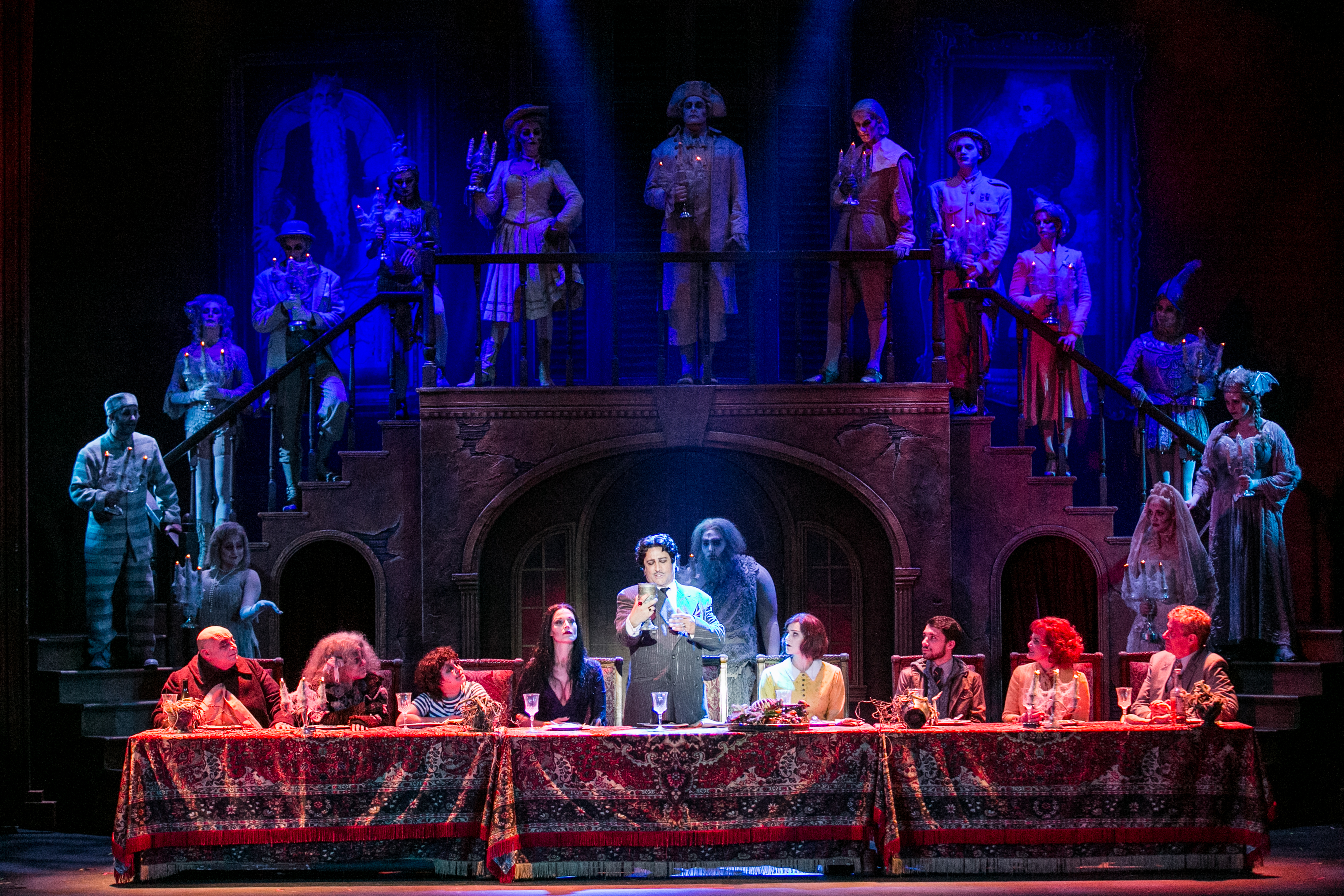 “Though I’m told it’s wrong when I sing my song, she accepts, she attends, she believes, she befriends… It’s a dream that’s coming true, when the moon says ‘I love you’.” (Anthony Gruppuso as “Uncle Fester” sings of his “true love” for all his “Ancestors” to hear.)