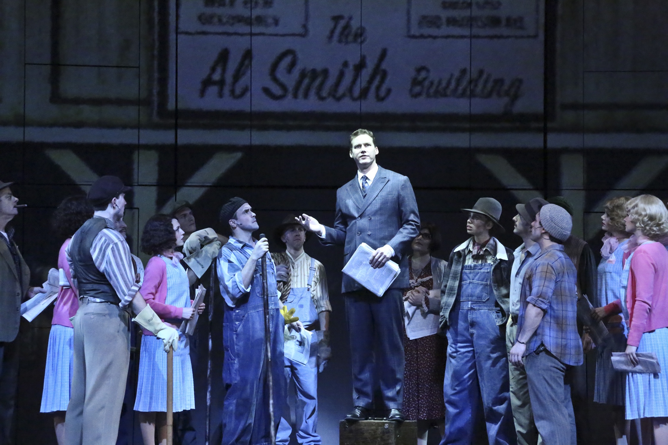 Michael McCormick is also a genuine stage presence to be reckoned with as New York’s ex-Governor and Presidential candidate, “Al Smith”. “When it rains, I pour” he says, in one of many top-notch examples of exactly how sharp and clever Sherman and Hull’s libretto is (–he also has one of the very best sight gags in the entire show—or several others for that matter!) Likewise, Tony Sheldon matches him note for note and laugh by laugh as his partner in this monumental enterprise, John J. Raskob. Throughout, they inject the proceeding with a terrific jolt of good old-fashioned ‘razzmatazz” and plenty of vaudeville-tinged levity in the mode of brilliant comedy teams like “Weber and Fields”. One of several first-rate duets McCormick and Sheldon share is “Moxie”. A delightful (and delightfully shameless) ode to themselves and all the other era-defining “Robber-Barons” who called themselves “Captains Of Industry”, they harmonize “We’re a lot of ego and a little clever.” Sure it’s a tall order, but this pair have “moxie and a melting pot of ‘can-do!’” After all, these were men who, they tell us, “kept inspiring the people of this country, and kept reaching for the top!” (–being sure that their pockets were well-lined along the way, of course!)