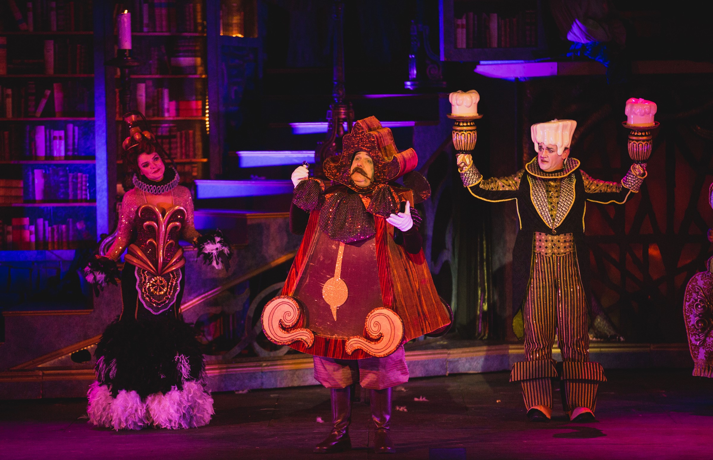 “When we’re human again, only human again–When the girl finally sets us all free, Cheeks a-bloomin’ again! We’re assumin’ again, we’ll resume our long-lost joie de vie!” Melina Kalomas as ”Babette”, Joey D’Auria as “Cogsworth” and Dennis Kyle as “Lumiere” dream of the day they’ll be ‘Human Again”