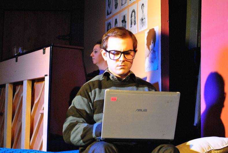 “When you’re taken they all flock by the score; but then (take it from me) the second that you’re free the girls you thought would want you don’t want you anymore!” Alex Allred as “Luke” shows Brad Simanski as “Darren” “The Way To Get A Girl”