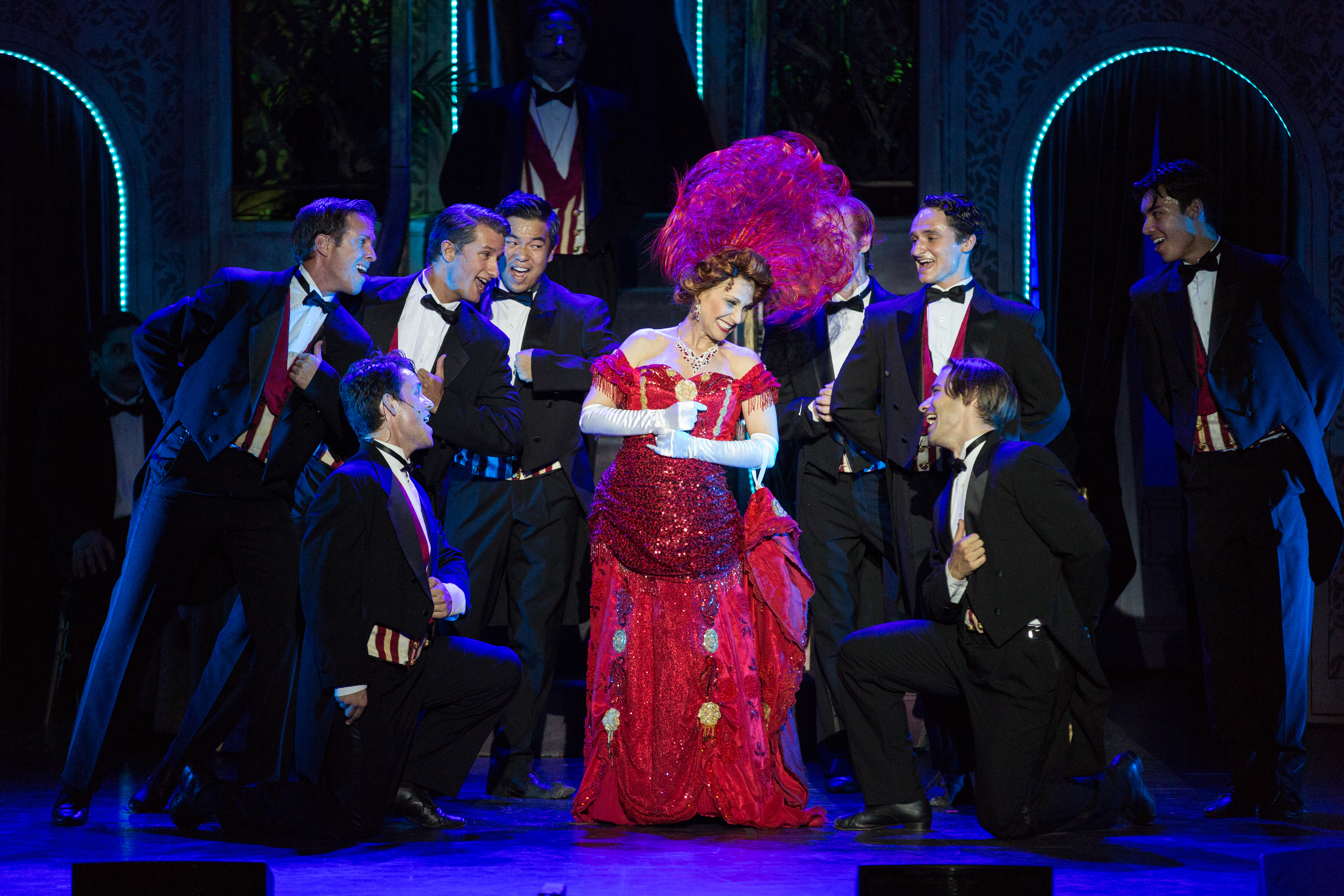 John Iacovelli’s set design is reminiscent of an old Victorian ‘Paper Doll’ house, or like looking at a vintage tintype photograph through the lens of an antique stereopticon. His take on “The Harmonia Garden” (which dominates the show’s latter half) is aptly grand, glittery and graceful, commendably recalling such ‘sophisticated’ ‘Knickerbocker’ establishments that might easily fit into a story by Henry James. Iacovelli’s contribution is effectively enhanced by Jean-Yves Tessier’s equally effervescent lighting—whether bright and festive while illuminating “Before The Parade Passes By” or sparkling and multi-hued as permeates “The Harmonia Garden’s” ‘lights of 14th Street”. Jessica Kuhns’ and Alexandra Johnson’s costumes too, are splendidly colorful, ranging from Irene and Minnie’s stylish “Gibson Girl” inspired Shirtwaist designs, to Cornelius’ more homespun gingham-checked, high-collar ‘go to meeting’ suit, to Dolly’s daring fire-engine red gown for her big ‘staircase number’–complete with a matching feathered head-piece (which, we’re told, none other than Broadway’s original “Dolly”–Carol Channing actually wore!) Not to be discounted either is Musical Director Diane King Vann’s creditable work overseeing the 17 piece orchestra.