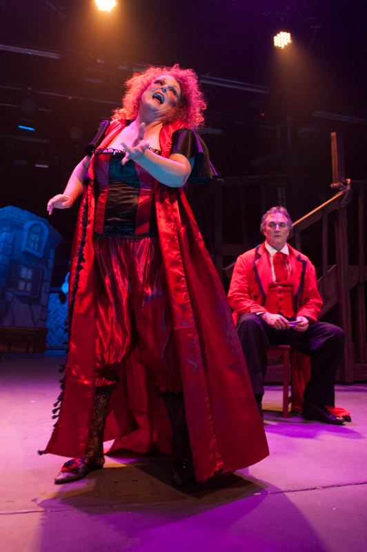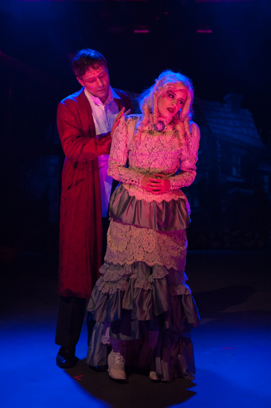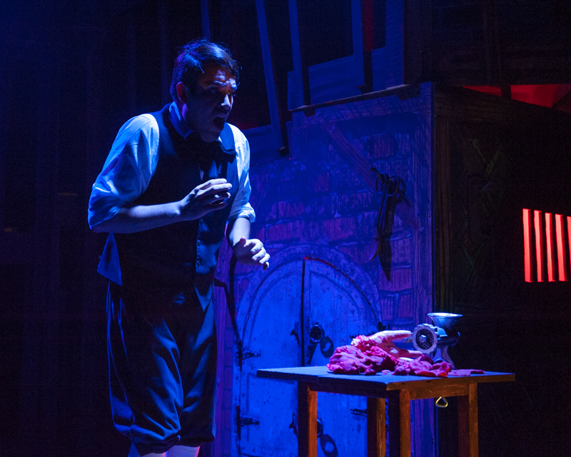 Although it may seem presumptive or ‘too far afield’ to suggest that a show like this ‘lives’ or, (pardon the pun) ‘dies’ predicated on its supporting technical elements, they can most assuredly help it—and in this regard this ‘little theatre company that could’ proves once again, not only that it can—it does (and in the most hair-raising ways!) As a whole they join forces to create a merrily macabre mood. Wally Huntoon’s set is a deceptively disarming cobblestone and wood shingle re-imagining of “Fleet Street” that’s almost a ‘gingerbread-esque’ take on an Old English village worthy of a Christmas Card; but appearances can be deceiving—this is also the ‘quaint’ view of a Britain that harbored the likes of “Burke and Hare” and “Jack The Ripper” (and Huntoon’s set catches the essence of this so well—it’s scary!) John Hyrkas and Dan Baird’s creative lighting design employs several bold primary colors to incredible and at times, symbolic effect—particularly murky green, subdued purple, ethereal orange and shocking crimson. They also utilize up-lighting from the footlights to cast disquieting shadows across the faces of the cast at key moments (as in the various verses of “The Ballad Of Sweeney Todd”.) This insightful interplay between shadow and light is sagaciously applied amid the flashback sequence as we uncover how Todd’s wife “Lucy” was ultimately tricked and violated by the so-called “Honorable” Judge Turpin once her husband was “transported for life”.