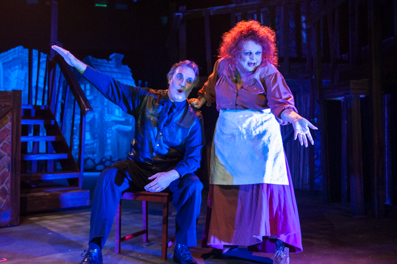 “Them handles is chased silver ain’t they?” Beth Hansen as “Mrs. Lovett” ‘re-acquaints’ David Stoneman as “Sweeney Todd” with some ‘old friends’ in “One More Productions’ “Sweeney Todd, The Demon Barber Of Fleet Street”