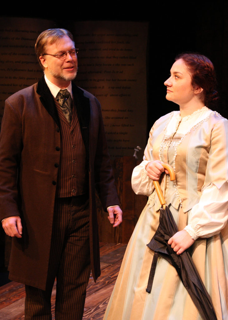 “If I have noticed nothing else about you, Miss March, I have noticed that you are unique. Something you should try not to forget.” Nicholas Thurkettle as “Professor Bhaer” chides Ashley Arlene Nelson as “Jo” regarding her “Blood and Guts stuff” manuscript in The Chance Theater’s “Little Women—The Broadway Musical”