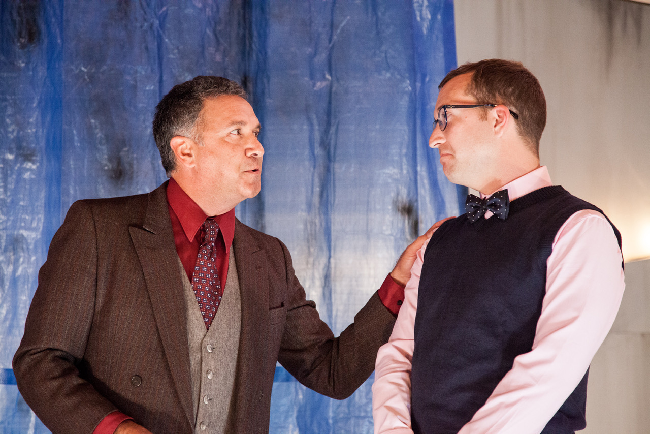 “I saw gray skies, foreboding and cold! I saw gray skies and made them rain ‘gold’–now those skies aren’t so bleak to behold!” Gary Lamb as “Caldwell B. Cladwell” enjoys a celebratory moment with Jamie Pierce as his assistant, “Mr. McQueen” in “The Coeurage Theatre Company’s” production of “Urinetown: The Musical”