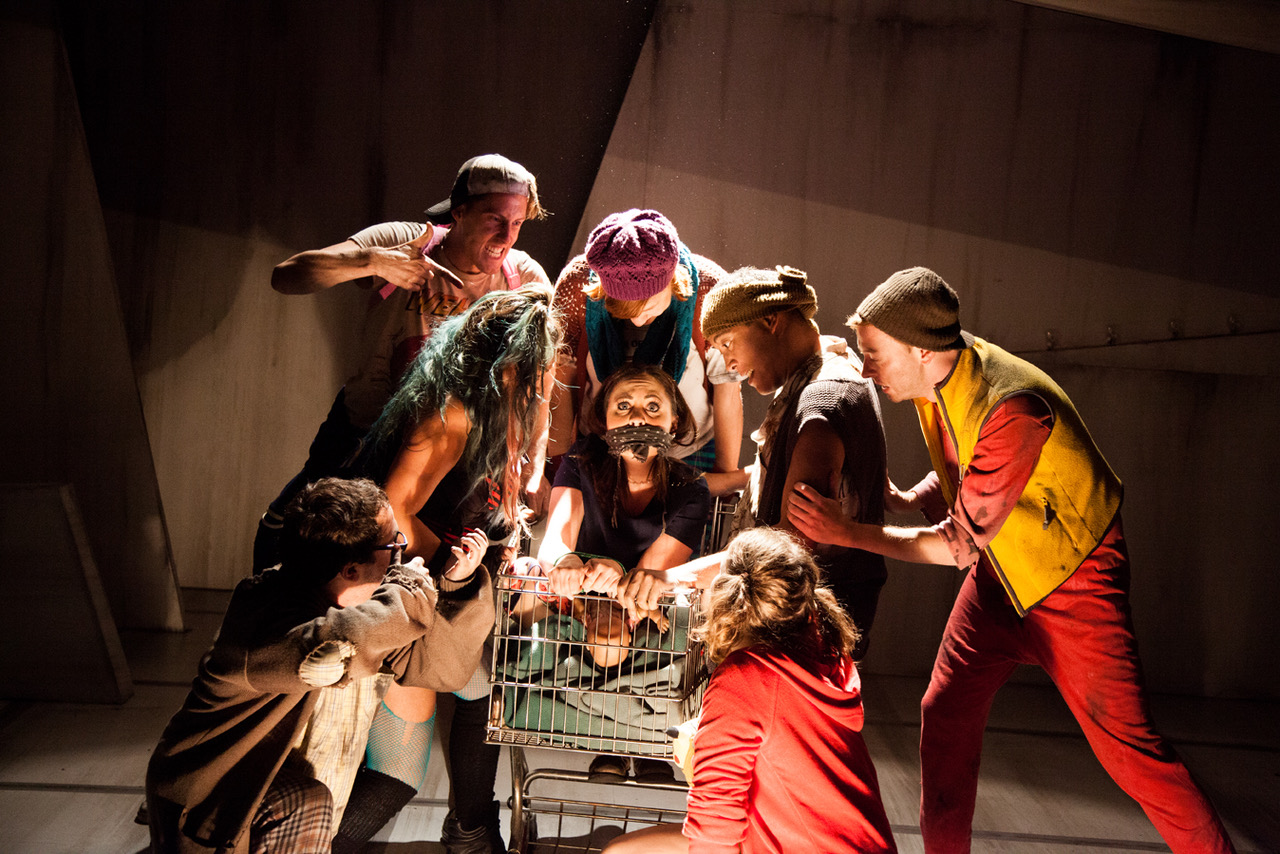 “Look at her there, all bound up, gagged and tied! With her head full of hair and her heart full of pride!” With “Hope” as their hostage, the revolting rabble debate what to do with her in “The Coeurage Theatre Company’s” production of “Urinetown: The Musical”