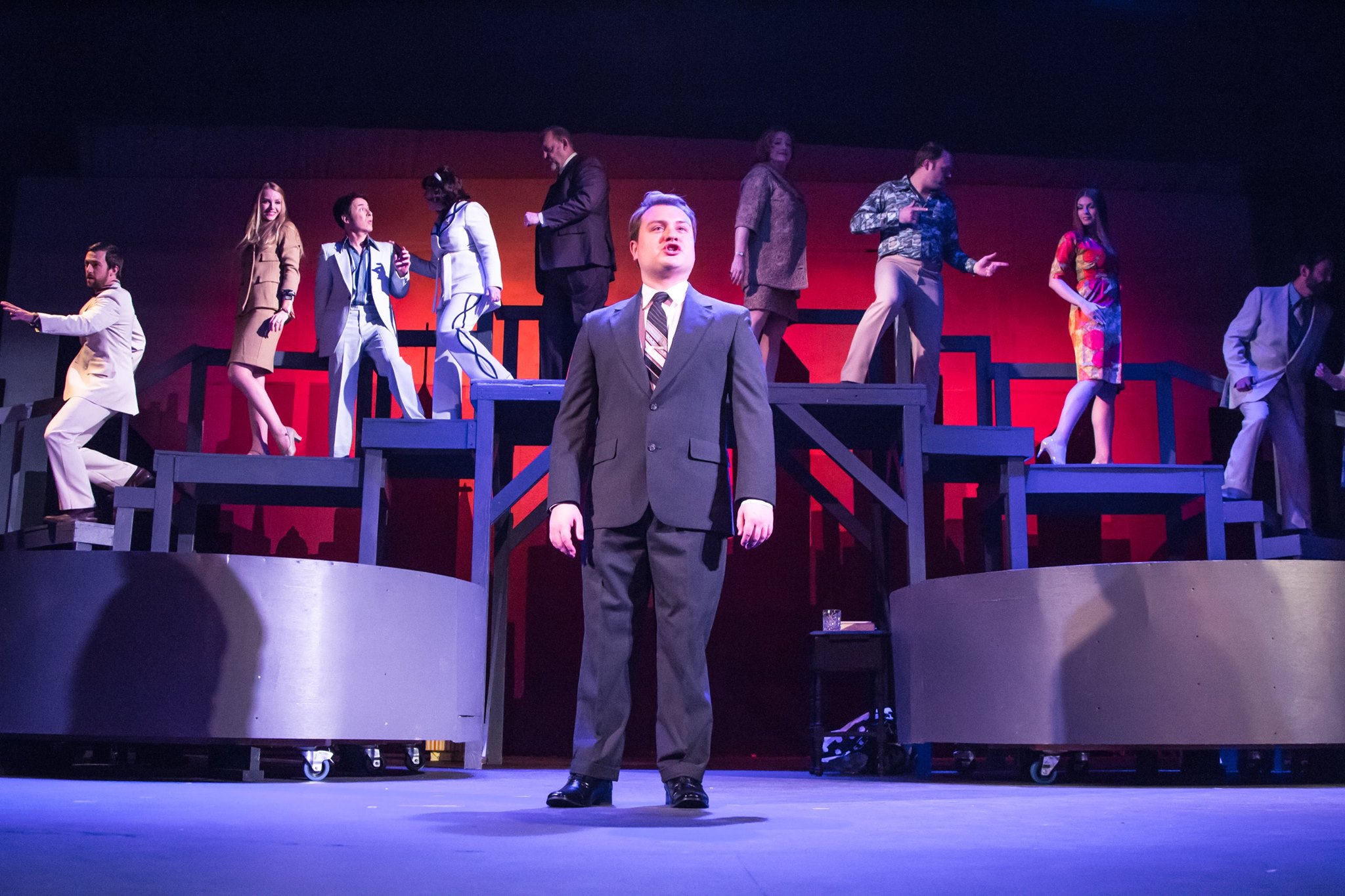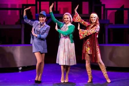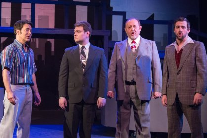William Wilday’s dapper multi-level set design provides a more than serviceable space for the action to be played out on, while at the back is an expansive silhouette of the Manhattan sky-line circa 1970. To this, various set pieces are brought on and off as needed—some of which also help recall the era, such as the big, multi-colored bean bag chairs utilized in one scene, or a “Mod” couch in another. With all the orchestrations pre-recorded, this makes the crisp, inventive sound design (including the city-soundscapes heard upon entry) by Bob Marino, Anne Gesling and Daniel Koh even more vital to the show’s success—in fact, on opening night it was Koh himself who was working the sound board cueing all the songs! Likewise, Ovation Award-winner, Michael Mullen’s costume designs are an out-and-out wonder—epitomized by some of the liveliest colors and styles this side of a Haight-Ashbury consignment shop! Among them, expect to encounter plenty of pastel leisure-suits (for both men and women,) love beads, fringed-vests, and go-go boots–all of which firmly recall those far-out and funky fashions that earmarked the years infamous for “Watergate”, “The Partridge Family”, “Spiro Agnew” and “Rodney Allen Rippy”!
