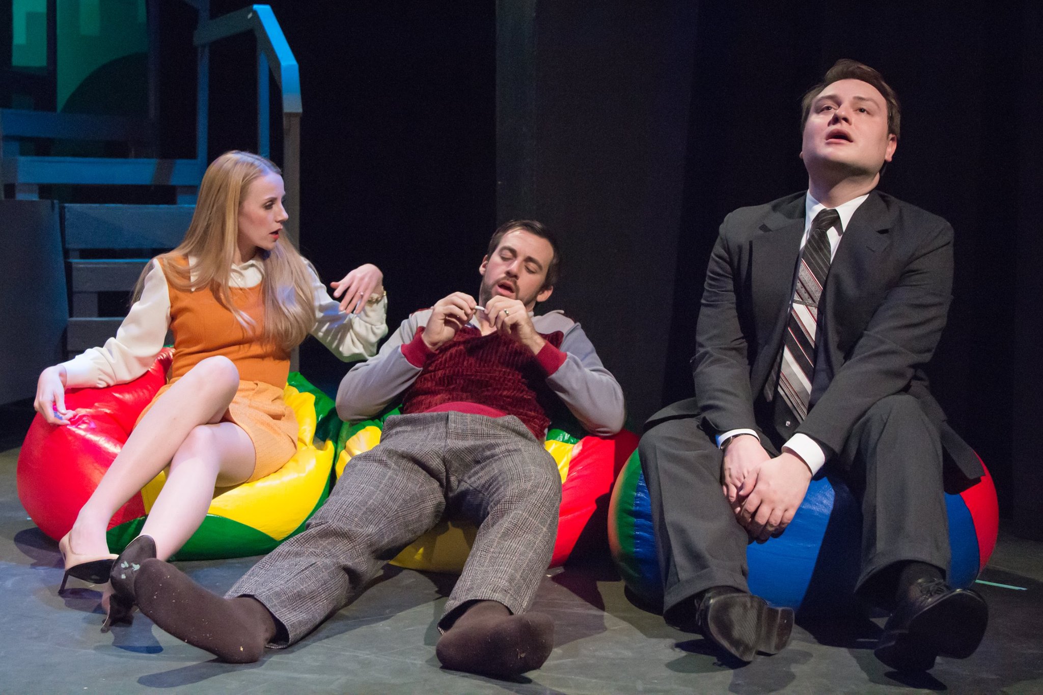 “It’s not like I’m avoiding marriage…it’s avoiding me, if anything. I’m ready!” Paul Luoma as “Robert” finds a few hits on joint can bring out the truth with Devon Davidson as “Jenny” and Brian O’Sullivan as “David” in “The Morgan-Wixon Theatre’s” Production of “Company”
