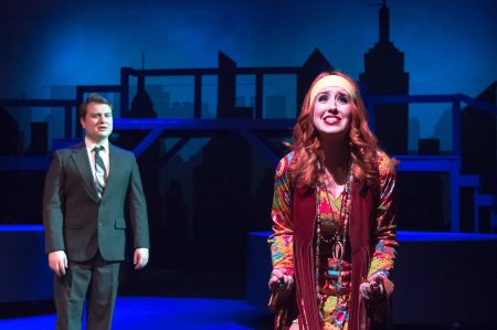 Sultry, stupendous and breath-taking all at once, “Tick-Tock” is by far, the show’s dynamic “crowning glory” as far as its terpsichorean offerings go. Right up there with her, is Alicia Reynolds-Luoma as the ‘Hippie’, “Marta”. Presenting us with a free-spirit and dyed-in-the-wool New Yorker, (think of her as something akin to the “Me Decade’s’” answer to “Sex And The City’s” Carrie Bradshaw.) Upon explaining her feelings for the city she’s so proud of, she enthuses “The pulse of this city is me!” Ms. Luoma also shines (–make that ‘incandesces’) with the amazing rapid-fire delivery of “Another Hundred People”. Meanwhile, Emilia Sotello’s animated take on the pleasantly vapid flight-attendant “April” earned her some humongous laughs and scores major comic points, largely involving her second act “seduction” scene (where, in the end our man Rob may have gotten more than he bargained for—a girl who actually stays overnight!) She too, an deliver a great song, and her duet with Mr. Luoma, a “post-delectation”/“morning-after malaise” descant called “Barcelona” is an unqualified victory for them both. Then, in concert with Mesdames Luoma and Combs, the three make delightful music together with their “You Could Drive A Person Crazy” being a first-rate achievement all-around (Think of them as sort of like “The Andrew Sisters” in hot-pants!)
