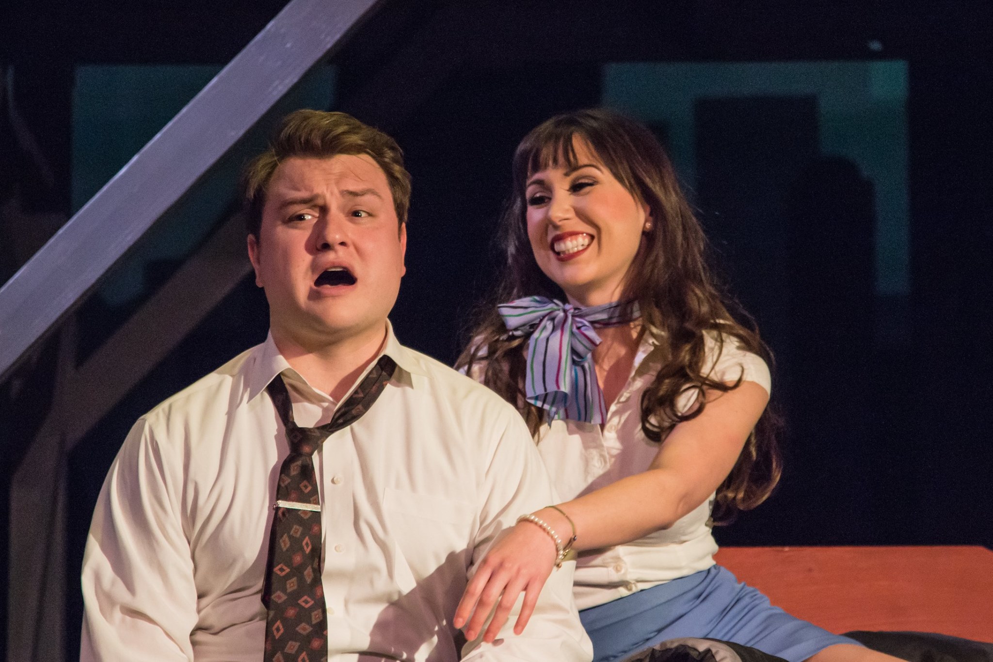 “You’re a very special girl—not just overnight! No, you’re a very special girl, and not because you’re bright—er, not JUST because you’re bright, June…” Paul Luoma as “Robert” tries to cajole Emilia Sotelo as “April” into not going to “Barcelona” in “The Morgan-Wixson Theatre’s” Production of “Company”