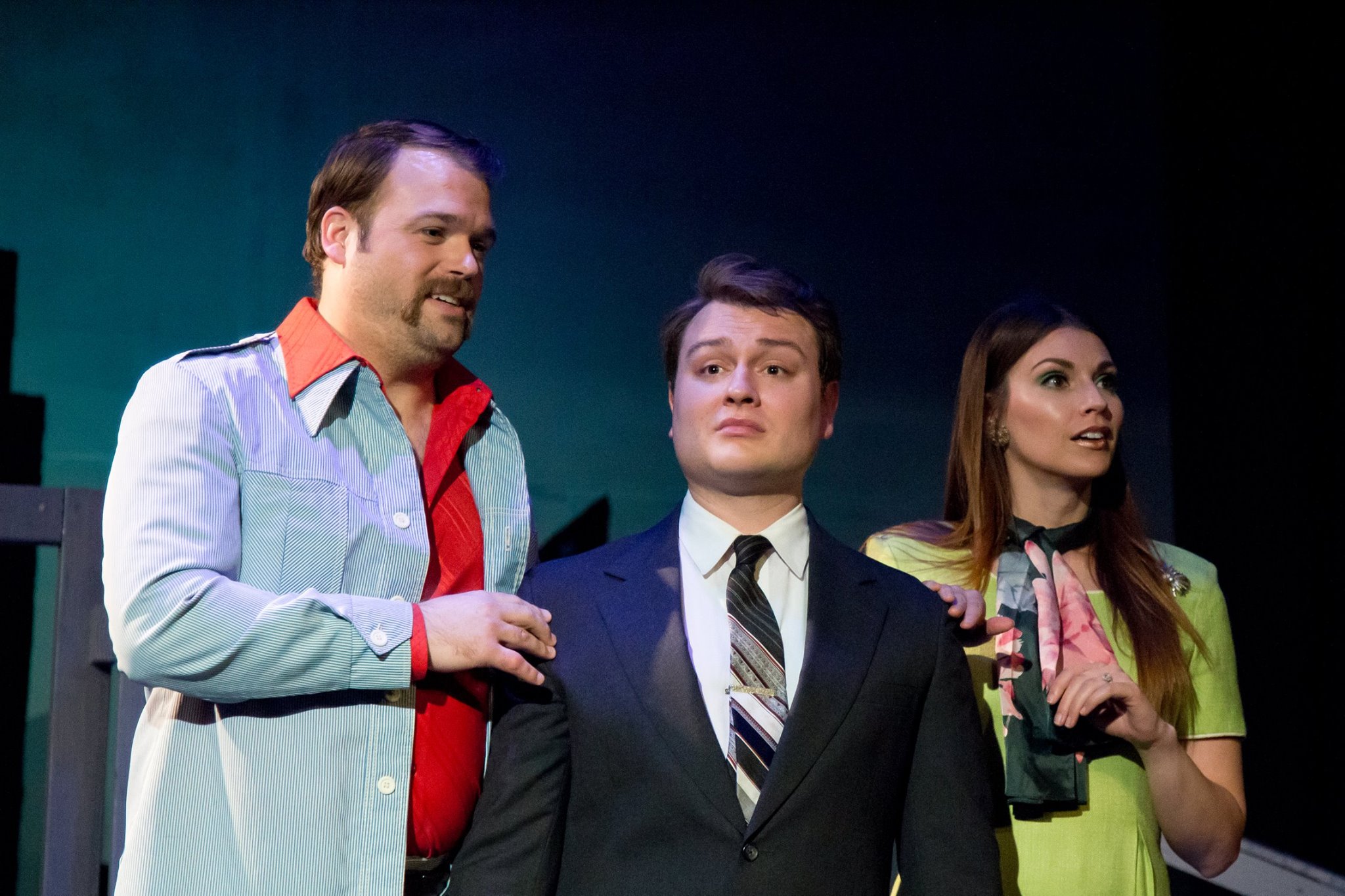 Next, we meet Amanda Greig as “Susan” and Spencer Johnson as her perpetually on-the-make hubby, “Peter” (this two-some is so ‘hip’ and ‘happening’ that they literally get a divorce just so they can “live together”!) Of all the couples, they may have an ‘angle’ concerning their friendship with this single chum, but here too, this is kept judiciously subtle allowing the individual viewer to decide for themselves what the subtext may—or may not, be at play here. Both Greig and Johnson are similarly vocal forces to be reckoned with, and he does a fine job with his part in “Have I Got A Girl For You”, which sees all the ‘husbands’ reunite to extol the virtues of staying single while you can (“Marriage may be where it’s been, but it’s not where it’s at” they crow.) Shortly thereafter, there’s Devon Davidson who categorically charms as “Jenny”, described as ‘the eternal square’. Ms. Davidson is herself in possession of a sumptuous voice, which she demonstrates all through the proceedings—even doubling along with Ms. Greig as a team of “Wedding Singers” toward the close of the first act. Along with Brian O’Sullivan as her ‘other half’ “David”, the pair also supply an ample dose of laughs during their scene in which Robert joins them to try partaking in a little a marijuana (something also pretty scandalous for the times.)