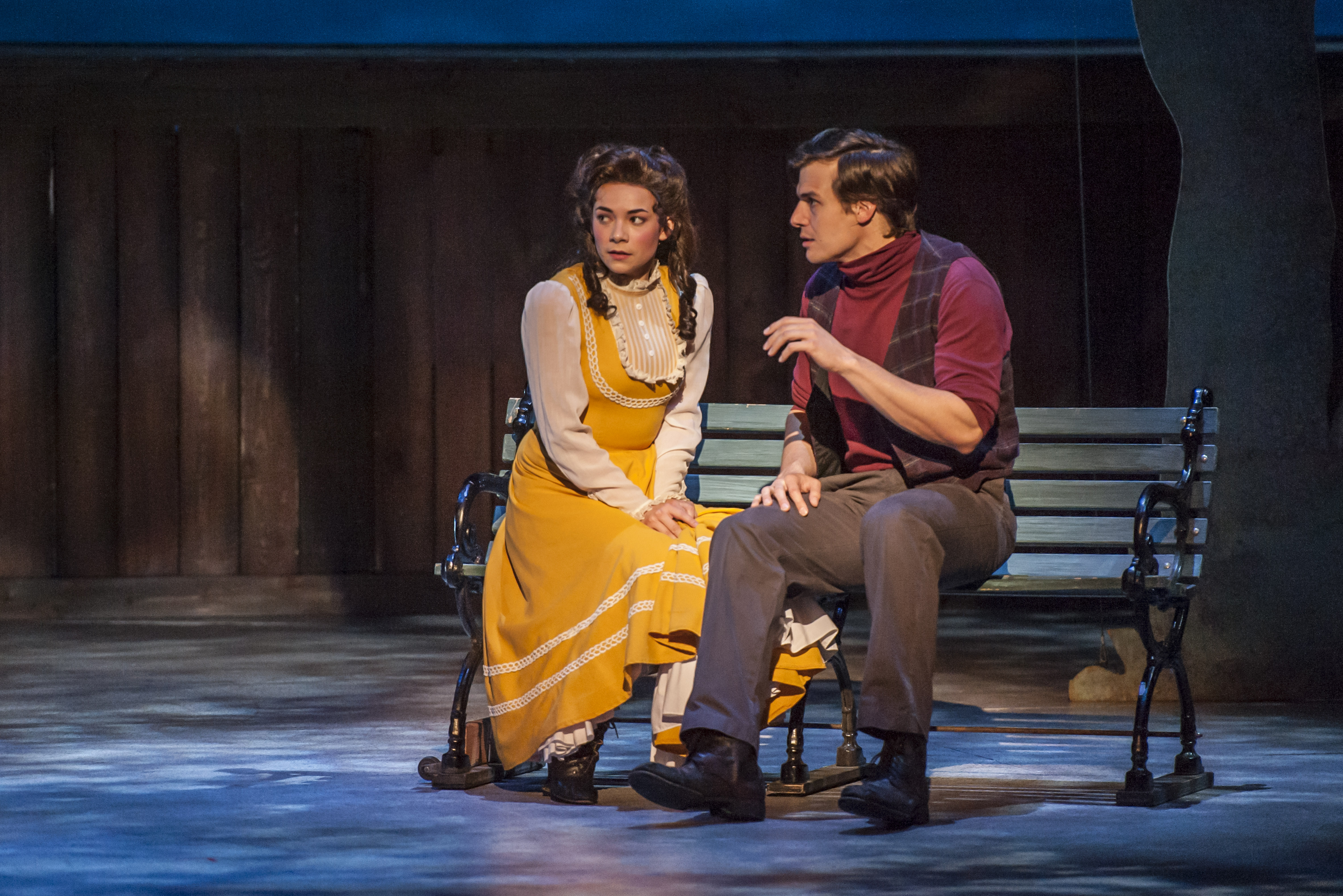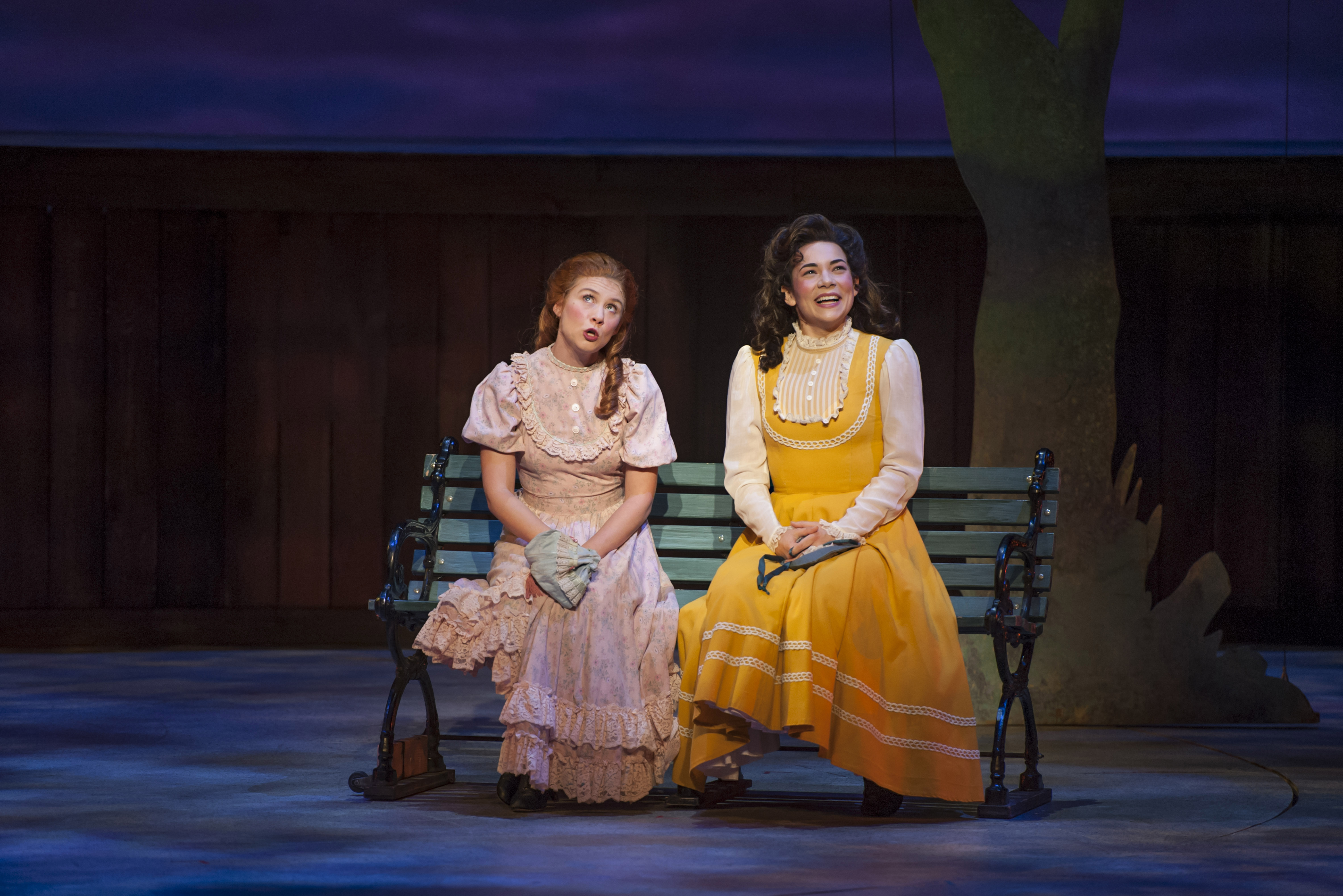 “When we work in the mill, weavin’ at the loom, you gaze absent-minded at the roof–and half the time your shuttle gets twisted in the threads, ’till you can’t tell the warp from the woof!” Amanda Hootman as “Carrie Pipperidge” tries to discern what’s going on with her friend, Amanda Leigh Jerry as “Julie Jordan” in “Musical Theatre West’s” production of “Carousel”