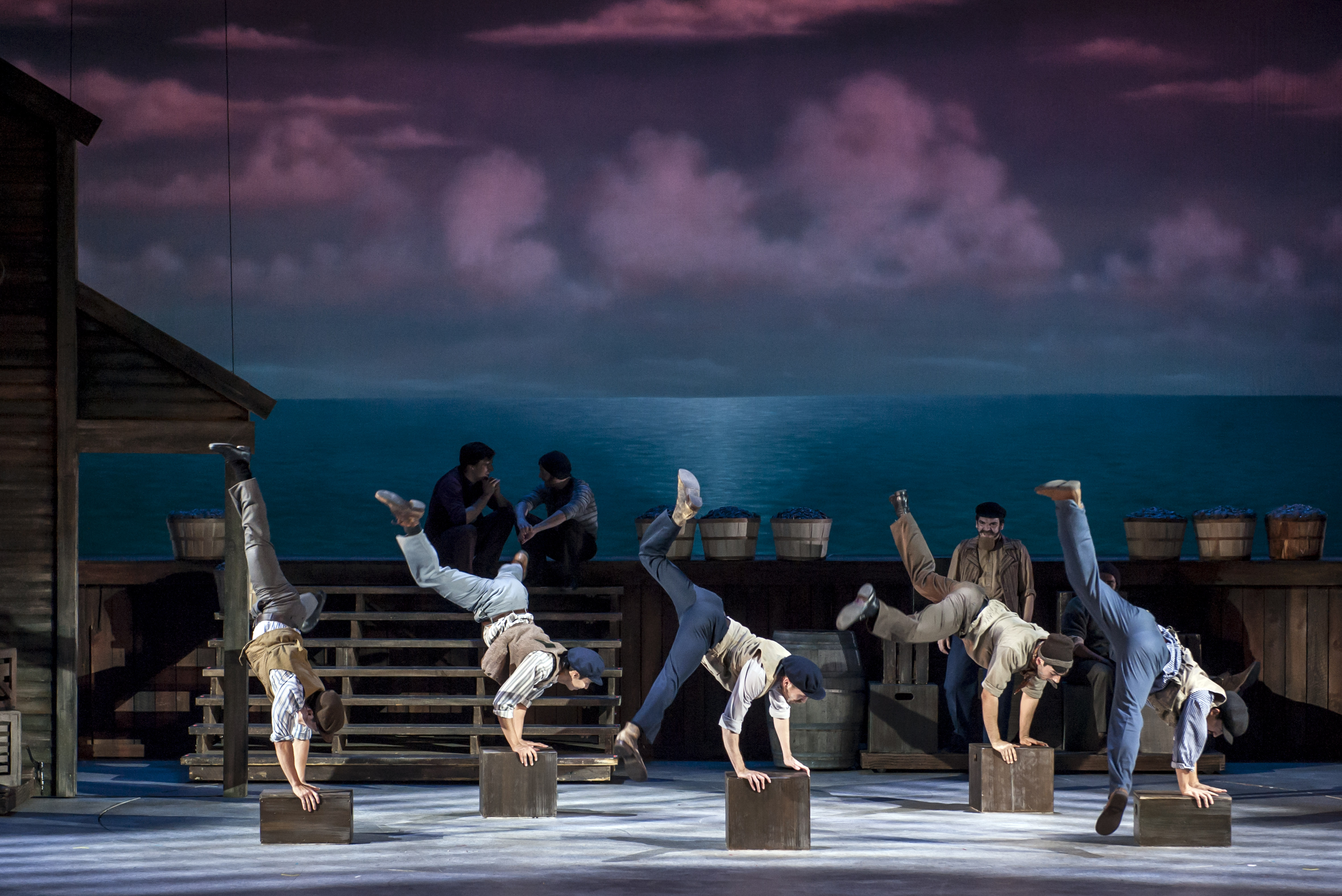 Instead, he temporarily pre-empts the terpsichorean ‘fire-works’ until just after, saving them for the jaunty sea chanty, “Blow High, Blow Low” which showcases the men doing a first-class sailor’s “Hornpipe”—executed on crates and complete with related ‘hambone-inspired’ hand and arm gesticulations; then when the ladies join in, it gets downright acrobatic, before expanding into a blissfully grand amalgam of both a jig and waltz (and yes, these two disparate dance disciplines combine brilliantly!) Act One closes with a quick and lively reprise of “June Is Bustin’ Out All Over” as the gang all head off to their (fateful for some) clam–bake. After intermission, joined by the younger members of the cast (one of whom is cleverly ‘passed’ around on the shoulders of the ensemble) their collective conferral of “This Was A Real Nice Clam-bake” is an ebullient way to launch the admittedly heavier half of the show in still another light-hearted and nuanced way that truly is “fittin’ fer an Angel’s choir’! Of course, anyone remotely acquainted with either the stage or screen versions of “Carousel” is likely to recall the magnificent ballet that serves as the centerpiece of Act Two, and in keeping with the overall tone of the rest of the show, here it is incorporated smoothly and seamlessly–and is decidedly worth waiting for. It all leads to an exhilarative finale consisting of an almost reverential reprise of “You’ll Never Walk Alone” sung by the entire company!