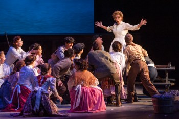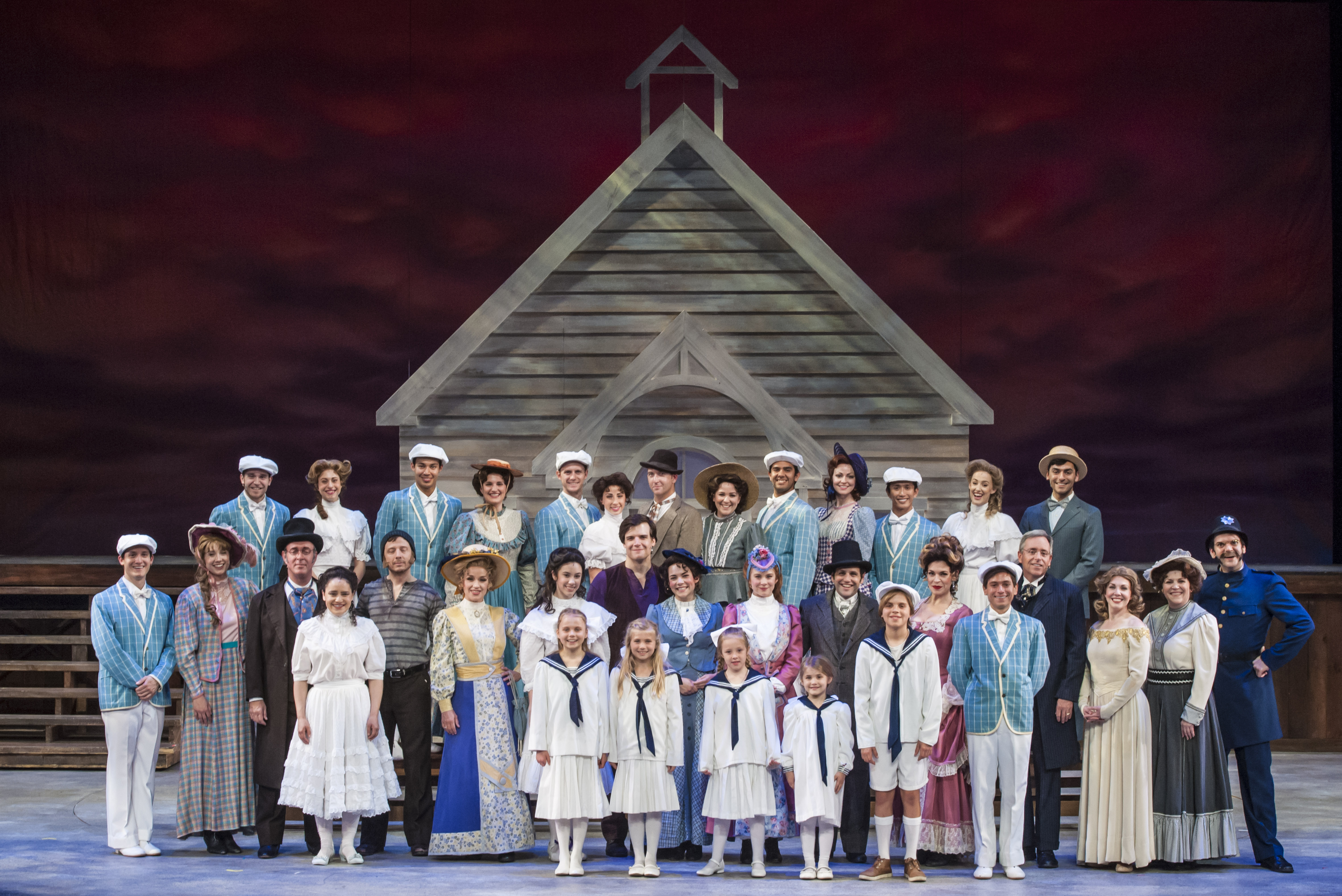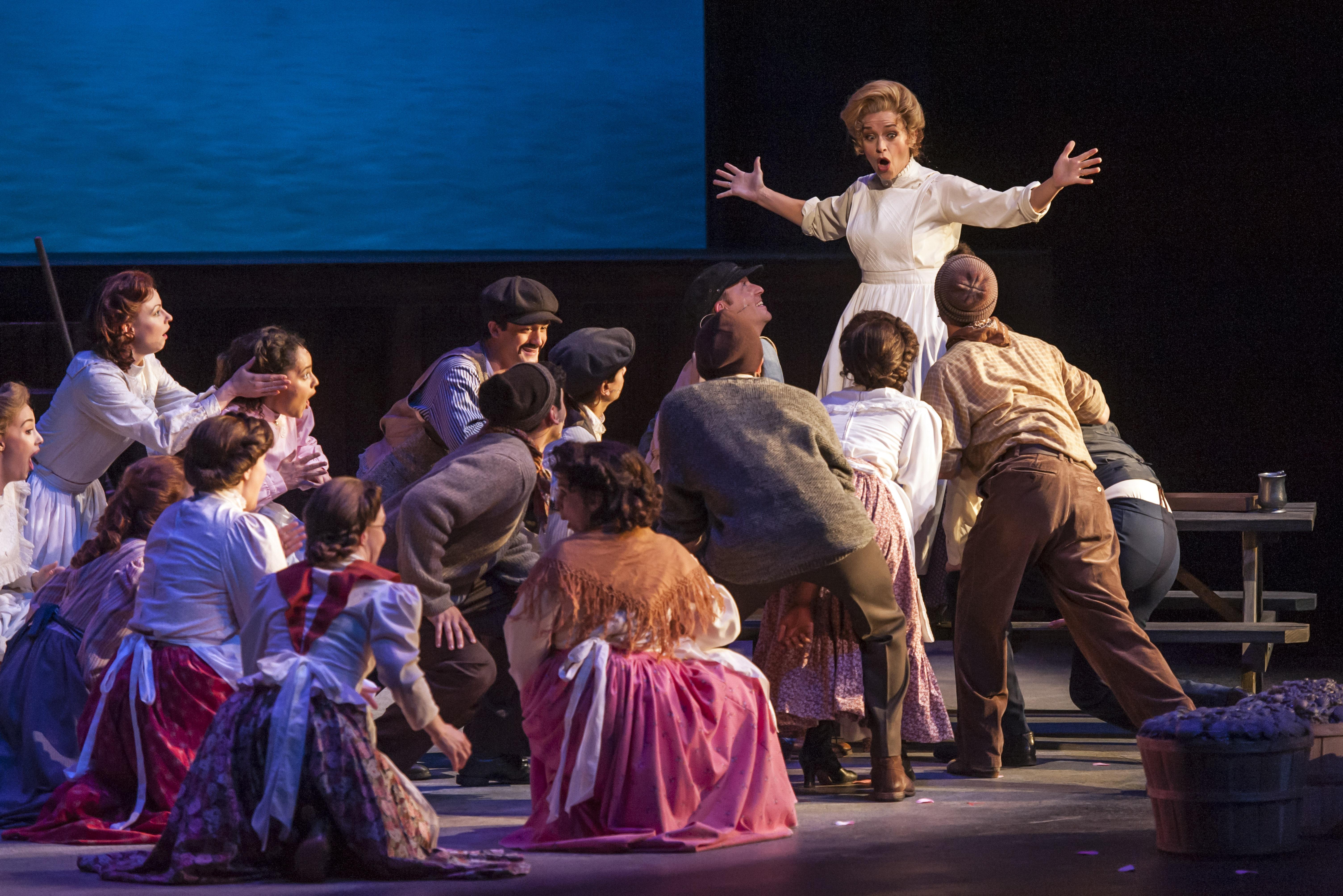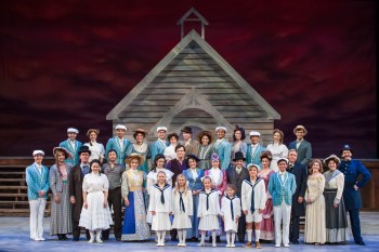 “June in bustin’ out all over! To ladies , the men are payin’ court! Lotsa ships are kept at anchor, jest because the Captains ‘hanker’ fer the comfort they ken only get in port!” Sarah Uriarte-Berry as “Cousin Nettie” leads the cast in celebrating when “June Is Bustin’ Out All Over” in “Musical Theatre West’s production of “Carousel”