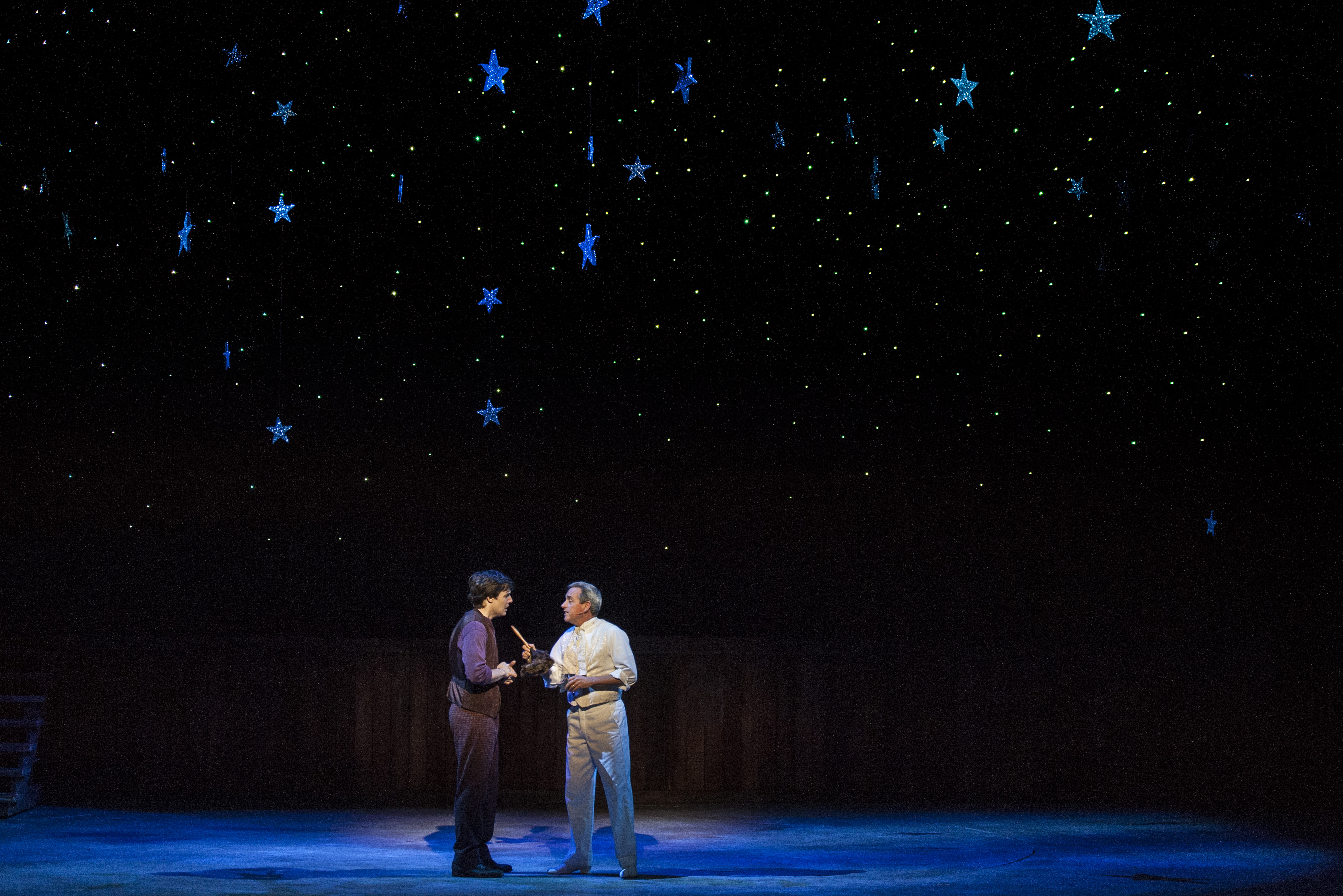 Centered around a nifty giant turntable, the rustic sets, picturesque drops and vibrant lighting projections (of which there are numerous) effectively set the stage, recalling a simpler and slightly more rough-hewn time and place. Similarly, in a production of this nature, the lighting effects take on an added importance where several key scenes suggest a carnival like atmosphere, or contrast against a quieter, moodier feel for others. Happily, Lighting Designer Paul Black’s choices never disappoint–aiding immensely in the concoction of this modern morality tale, whether they be through vivid light projections across the sets, backdrops or stage floor, or the glowing white incandescence which “Billy” and “Julie” are at turns delicately bathed in after the rest of the stage and follow spot fades, such as after their very first kiss. In addition, when “Billy” heads “up there” to meet his ‘Maker’, the stars themselves are a true visionary effect—immersing the back scrim in a multitude of winking white and blue sparkles! Moreover, Karen St. Pierre’s costume designs are bright, colorful, and germane to period (and caste)—and her dresses specifically are extra ‘flouncy’ for those many vivacious dance motions. Not to be marginalized either is the momentous contribution made by Musical Director, Dennis Castellano who deftly presides over the stately 28 piece orchestra!