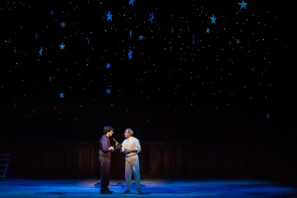 “Let the Lord shout and yell, let his eyes flash flame—I promise not to quiver when he calls my name! Let him send me to Hell, but before I go, I feel that I’m entitled to a Hell of a show!” Doug Carpenter as “Billy Bigelow” rails at Kevin McMahon as “The Star Keeper” demanding to be “Judged By The Highest Judge Of All” in “Musical Theatre West’s” production of “Carousel”