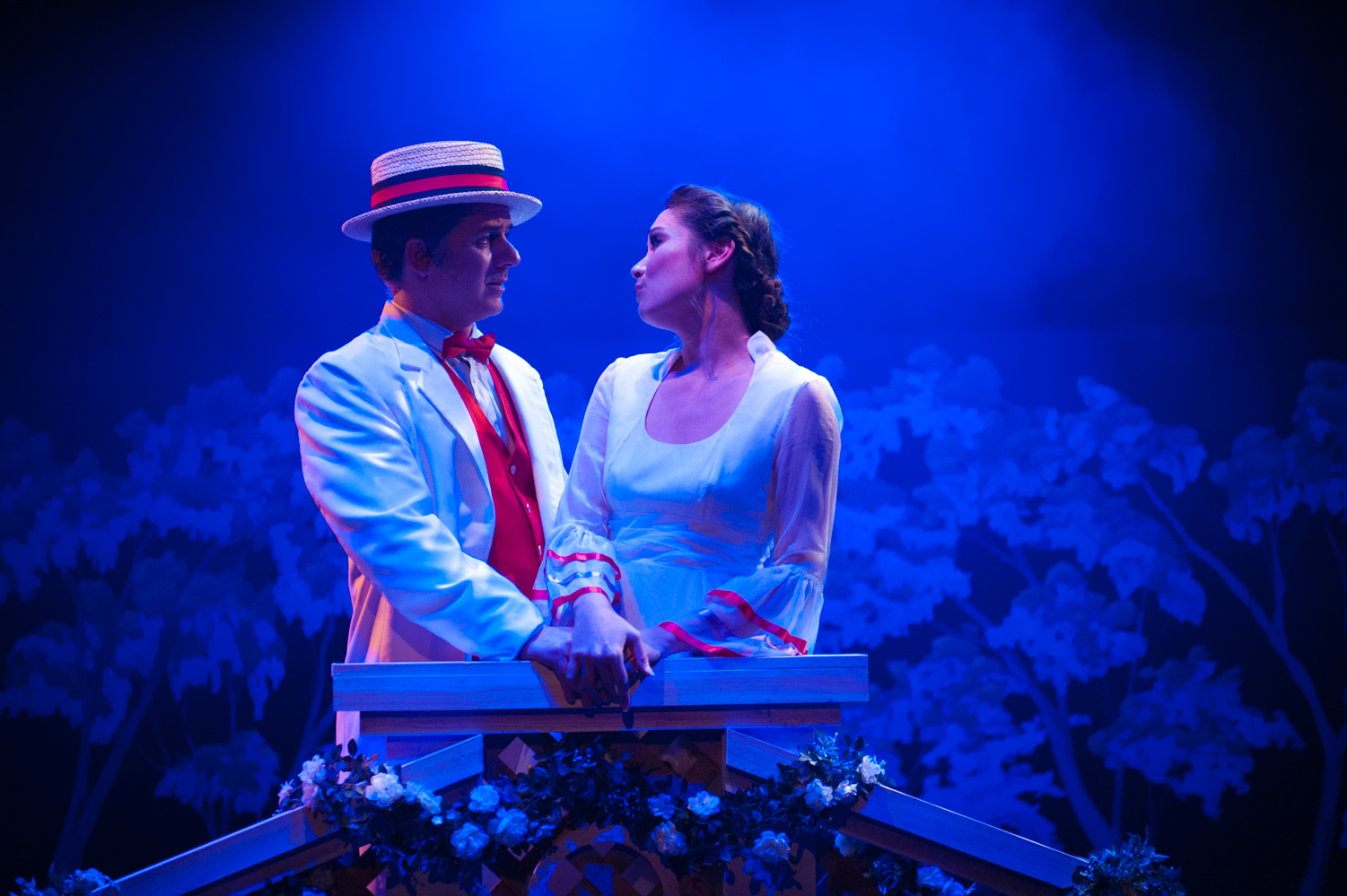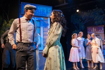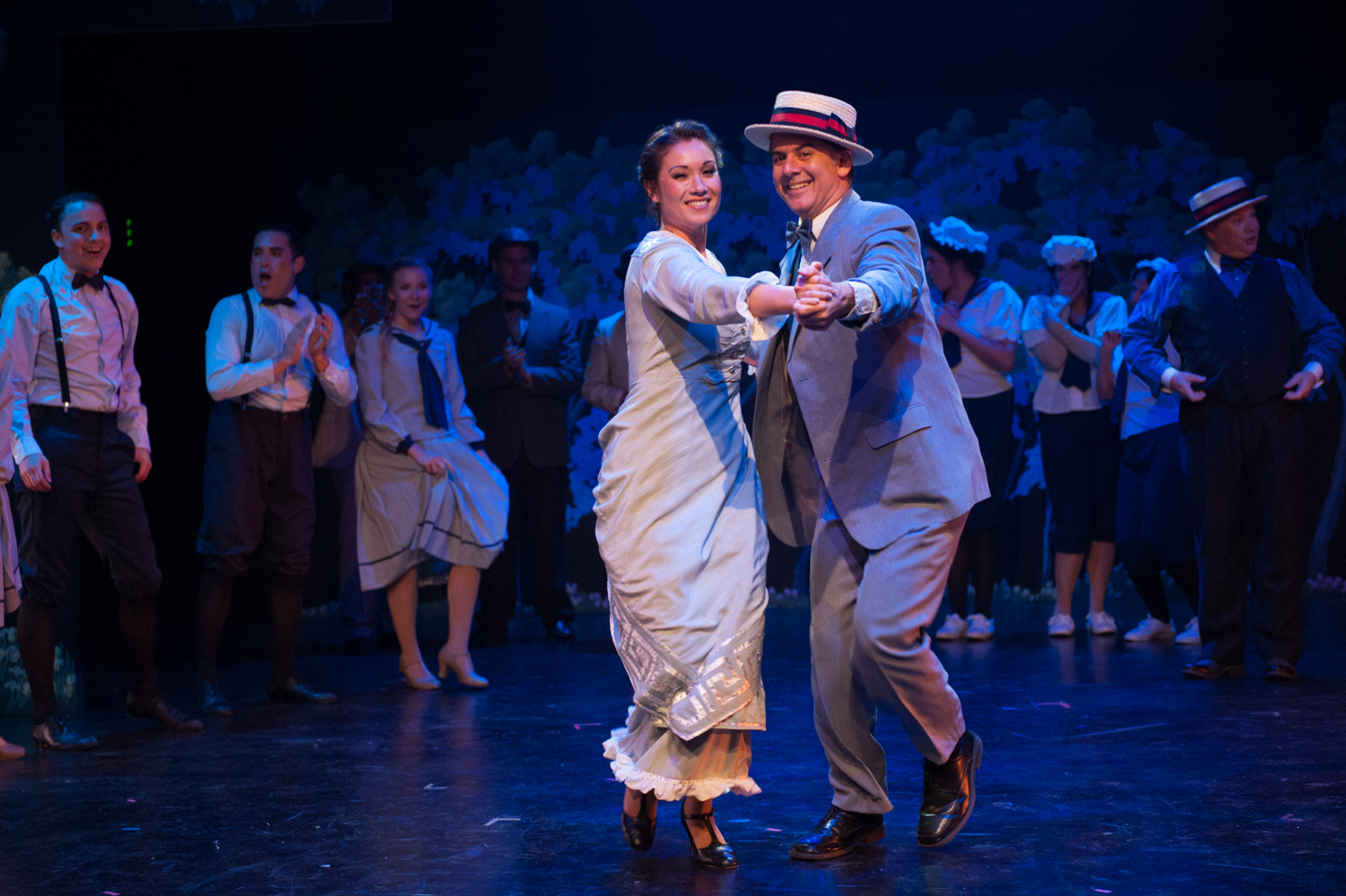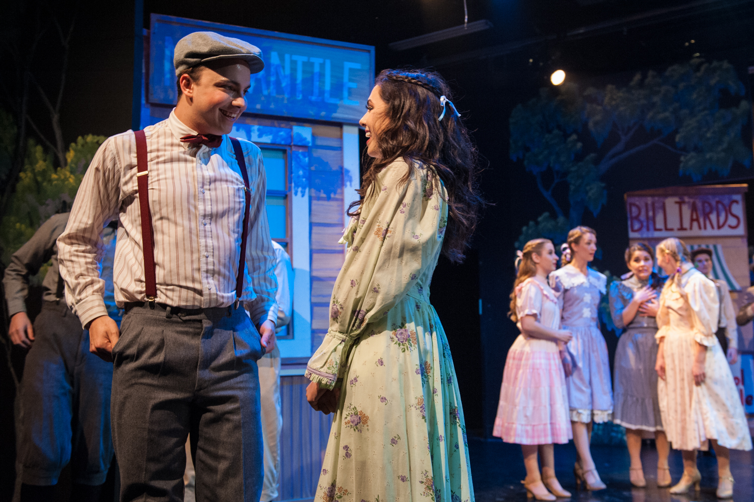 Like “Major Bowes” in a straw-hat and dandy bow-tie, at the center of all the action is Johnny Fletcher as “Professor Harold Hill” (and comparable to that acclaimed radio showman, he brings music and culture into everyone’s life!) Bestowing on us a more dapper, elegant (and charmingly roguish) Song-And Dance man reminiscent of say, Gene Kelly or Jimmy Cagney, he delivers a commanding “You Got Trouble” oozing unctuousness with every line! Shortly thereafter he practically beams–striking theatrical gold with the show’s signature piece—“Seventy Six Trombones”. However, in that they are both more ‘patter songs’ Fletcher doesn’t really get to truly exhibit his full vocal talents until the rapid-fire intonation of “The Sadder But Wiser Girl”, or when smoothly crooning “Marian The Librarian”; once he’s does though, it’s exceedingly worth the wait. He also excels with his 11 O’Clock reprise of “Good Night My Someone” just before the show’s climactic finale. Starring opposite him is Erika Baldwin as the town’s Librarian “Marian Paroo”.