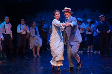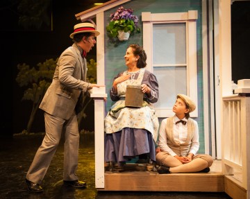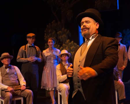 Wally Huntoon’s breezy, bucolic sets feature forested backdrops, clever fold-away and roll-on set pieces, which literally enable the town of “River City” to appear and disappear as needed, in a flash. Jon Hyrkas effervescent and colorful lighting design functions as a kind of prismatic punctuation to the stage-pictures materializing before us—furnishing just the right mood or essence of memory as required. Every bit as sublime are Larry Watts snazzy ‘Edwardian-era’ meets the mid-west’ pre-World War One period costumes, that make terrific use of gingham, ostrich plumed chapeaux, and layered dresses for the ladies and high collars, Ascot caps, derby and boater style hats, and Knickerbocker pants for the gentlemen, all with a correspondingly daring use of the color palate. Worthy of sizable regard too, is the ever diligent and dexterous seven piece orchestra (also under the guidance of Lorton) who collectively purvey the dulcet fuel for the show to soar on.