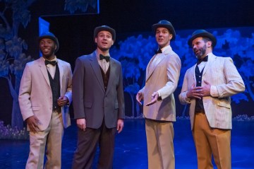 Timothy Klega also puts an estimable stamp on his portrayal of Hill’s former-cohort in the confidence-game now turned “Legit”, “Marcellus Wahburn”. Skilled with a considerable voice of his own, he belts it out to the back-row in Act One with his part in “The Sadder But Wiser Girl”, then again in Act Two” while leading “Shipoopi”. Meanwhile, John Gillies also impresses as “Charlie Cowell”, the rogue traveling salesman out to expose Hill, depicting him as less of a caricature, and supplying him with a stimulating believability. This makes his implied threats less artificial and more something palpable that our heroes have to deal with. Another, (albeit much younger and more diminutive) presence warranting just as much praise is Katie Bordelon in the role of Marian’s little ‘brother’, “Winthrop Paroo”. As “He”, she scores handsomely with “Gary, Indiana”—giving us a lively version of this playful, if oddly syncopated, favorite. Remarkable as well are guest-group “The Accidentals” as the four members of the school board who emerge as the town’s resident barbershop quartet. Often providing a musical juxtaposition to other songs, they too, are sure-fire crowd favorites–and they consistently succeed at entertaining–and even astounding—sans any accompaniment! Starting with the affable “Sincerely” and the classic “Goodnight, Ladies” (which serves as a melodious and complement to “Pick-A-Little, Talk-A-Little”,) each sounds as rich and warm as fresh churned butter—and all of the tunes they execute are as satisfying as we’d hope or expect. Their latter chanson, “Lida Rose”, when joined by Baldwin’s summery ‘rocking chair on the porch” solo, “Dream Of Now” burgeons into another knock-out post-intermission interlude this production can claim —and ranks as an all-around grand-slam home-run for everyone involved.