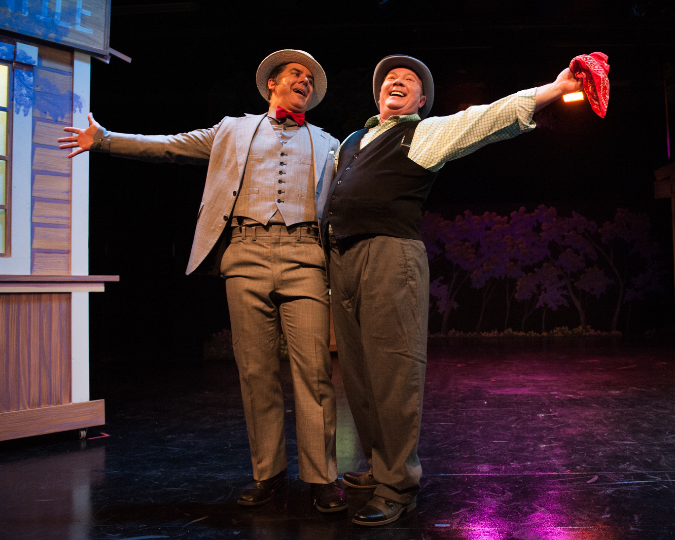 “I smile—I grin, when the gal with the touch of sin walks in; I hope, I pray for the ‘Hester’ to win just one more ‘A’—the ‘Sadder-But-Wiser’ girl for me!” Johnny Fletcher as “Harold Hill” (L) and Timothy Klega ( R) as “Marcellus Washburn” sing the virtues of a gal with vice in One More Productions’ “The Music Man”
