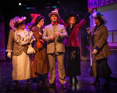 ‘That woman made brazen overtures—with a gilt-edge guarantee! She had a golden glint in her eye and a silver voice with a counterfeit ring! ” The ladies of River City: Brianna Garmon as “Ethel Toffelmier” (far L) Caitlin Trotter as “Alma Hix” (L) Shannon Page as “Eulalie Mackecknie Shinn” ( R) and Johnnie-Ann Mauer as “Maud Dunlop” (far R) warn Johnny Fletcher as “Harold Hill” (C ) about that Librarian who “advocates dirty books” in One More Production’s “The Music Man”