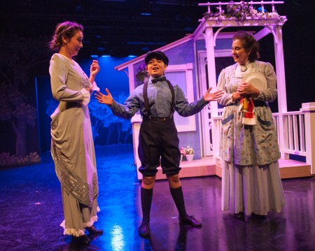 “If you’d like to have a logical explanation how I happened on this elegant syncopation, I will say without a moment of hesitation: There is just one place that can light my face!” Katie Bordelon (C ) as “Winthrop Paroo” sings the praises of “Gary, Indiana” to Erika Baldwin (L) as sister, “Marian” and Carmen Tunis (r ) as his mother, “Mrs. Paroo” during One More Productions’ “The Music Man”