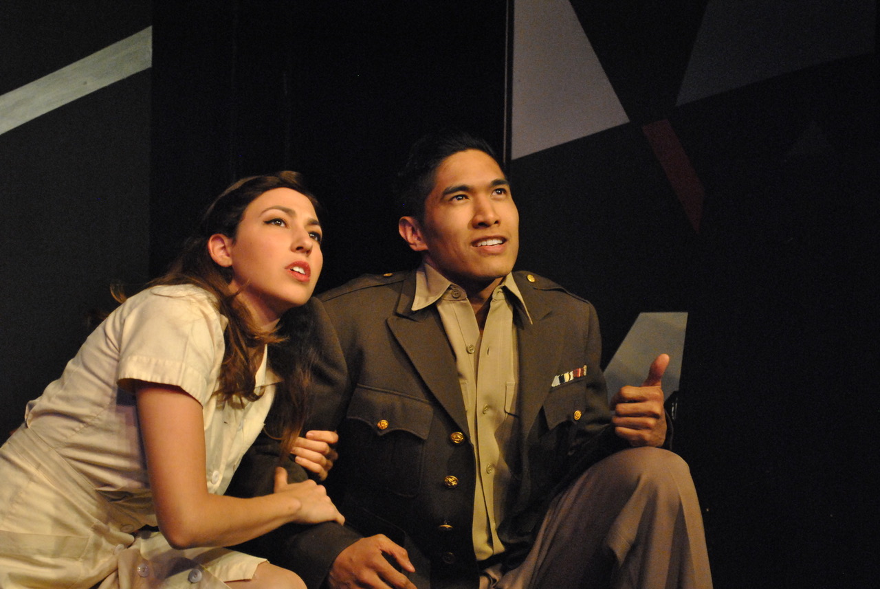 Starring a steadfastly talented and attractive cast, the first outing involves “The Soldier” and “The Whore”, set circa 1917 with him being a “World War One” era “Doughboy” and she, a winsome street-walker who predominantly ‘plies her trade” by the river: “Hey there—where you goin’ Soldier? Don’t you know my face? Come and tell your sweetheart where you been?” she beckons. When he tries to brush her off by admitting he hasn’t got the money she retorts smoothly, “Who mentioned money? Who mentioned pay? Guys I like don’t have to pay—guys like you, they get it free; here by the river, everything’s free.” As “The Whore”, Michelle Holmes imbues her character with a sultry vocal delivery, and a unique likeability—excelling with the show’s title number “Hello, Again”. Her take on the character is also decidedly sympathetic as well. She’s not there to corrupt anybody, but rather is someone involved in admittedly more severe circumstances who tries to give everybody a little understanding—which she’s looking for herself, but it isn’t always reciprocated. Thus begins our first ‘encounter’, commencing as a polite waltz before hastily disintegrating into something far more salacious. Before they’re ‘done’ he slyly ‘confiscates’ her shiny diamond brooch (an object that will re-emerge throughout the various occurrences we’re treated to here.) Then, he takes off—without delay! “We may never be saying ‘Hello Again’…” she sighs forlornly, but he is gone—to his next ‘engagement’. Next stop—a 1940’s U.S.O. hall, as an “Andrew Sisters”—like trio (only with a “Brother” thrown in) establish this new milieu with a jivey “Hep-Cat” sound fitting for the new decade. The soldier from the previous —now dressed in the uniform of a World War Two G.I.–enters with a young (and much less ‘worldly’) nurse, played with wide-eyed sincerity and enthusiasm by Allison Lind. “I’m shipping out tomorrow,” he croons to her “Don’t you want to give a lonely soldier something to remember you by?” Her idealistic pensive handling of her part in their musicalized ‘dialogue, “Kiss Me” is poignant and authentically personal: “You’re gonna write me from Paris aren’t ya?” she asks him before dolefully entreating, “Couldn’t you at least say you liked me?” Also striking all the right chords as “The Soldier”—in both periods—is Cesar Cipriano. With a strong commanding undertone to his voice (not to mention just as strong a ‘thrust’ amidst his earlier ‘tete-a-tete’!) He dazzles with “I Got A Little Time” which he capably conveys this swift-paced “scat” song so popular back in those days renowned for zoot-suits, ration-books, “Rosie The Riveter” and “Fibber McGee”. Shortly after, both Cipriano and Lind ‘cut an outstanding rug” Jitter-bug style, as Cipriano deftly demonstrates that he’s packing some markedly debonair dance-steps to boot, while they’re serenaded “40’s style” by a quintet of “dudes” and ‘dolls” a ’la such “Big-Band” groups like “The Modernaires”.