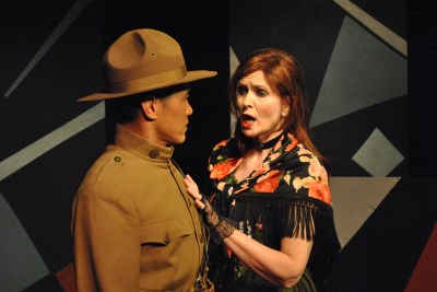 “I got a little time; I got a little itch; I got to get that itch scratched—and who’s gonna help me out? I’ve got to make it fast—the time I’ve got to scratch my itch may be my last!” Cesar Cipriano as “The Soldier” wants more from Allison Lind as “The Nurse” than just ‘talk’ in “The Chromolume Theatre’s” production of “Hello Again”
