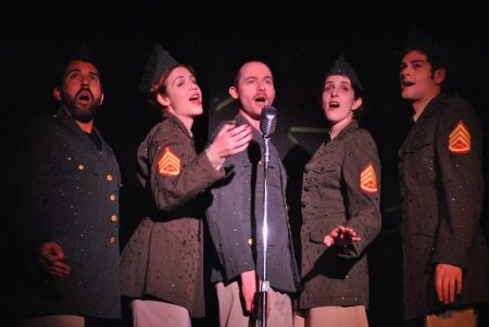 “We kiss and the Heavens cry; we kiss and the Angels die! After trying the one or two ways we start to lie; better to kiss and then say…” (L-R) Joe Hernandez-Kolski, Sarah Randall-Hunt, Corey Rieger, Tal Fox & Kevin Corsini are swinging–“Big Band” style in “The Chromolume Theatre’s” production of “Hello Again”