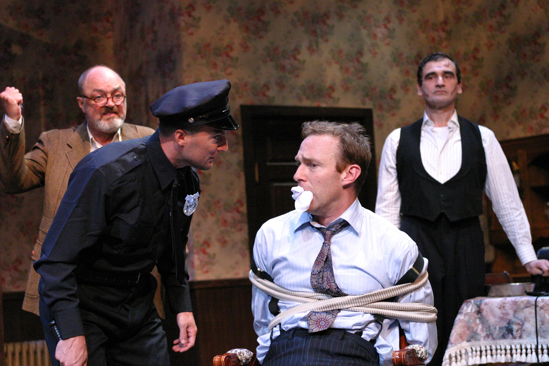 “Did they have that in the play you saw tonight? Gee, they practically stole that from the second act of MY play! Why in my second act, just before the—I better begin at the beginning…” Michael Antosy as “Officer O’Hara” is determined that J.B. Waterman as “Mortimer Brewster” is going to hear the plot of his new play one way or another while Ron Bottitta as “Dr. Einstein” and Gera Hermann as “Jonathan” try to play it cool in “The Odyssey Theatre Ensemble’s Production of “Arsenic And Old Lace”