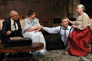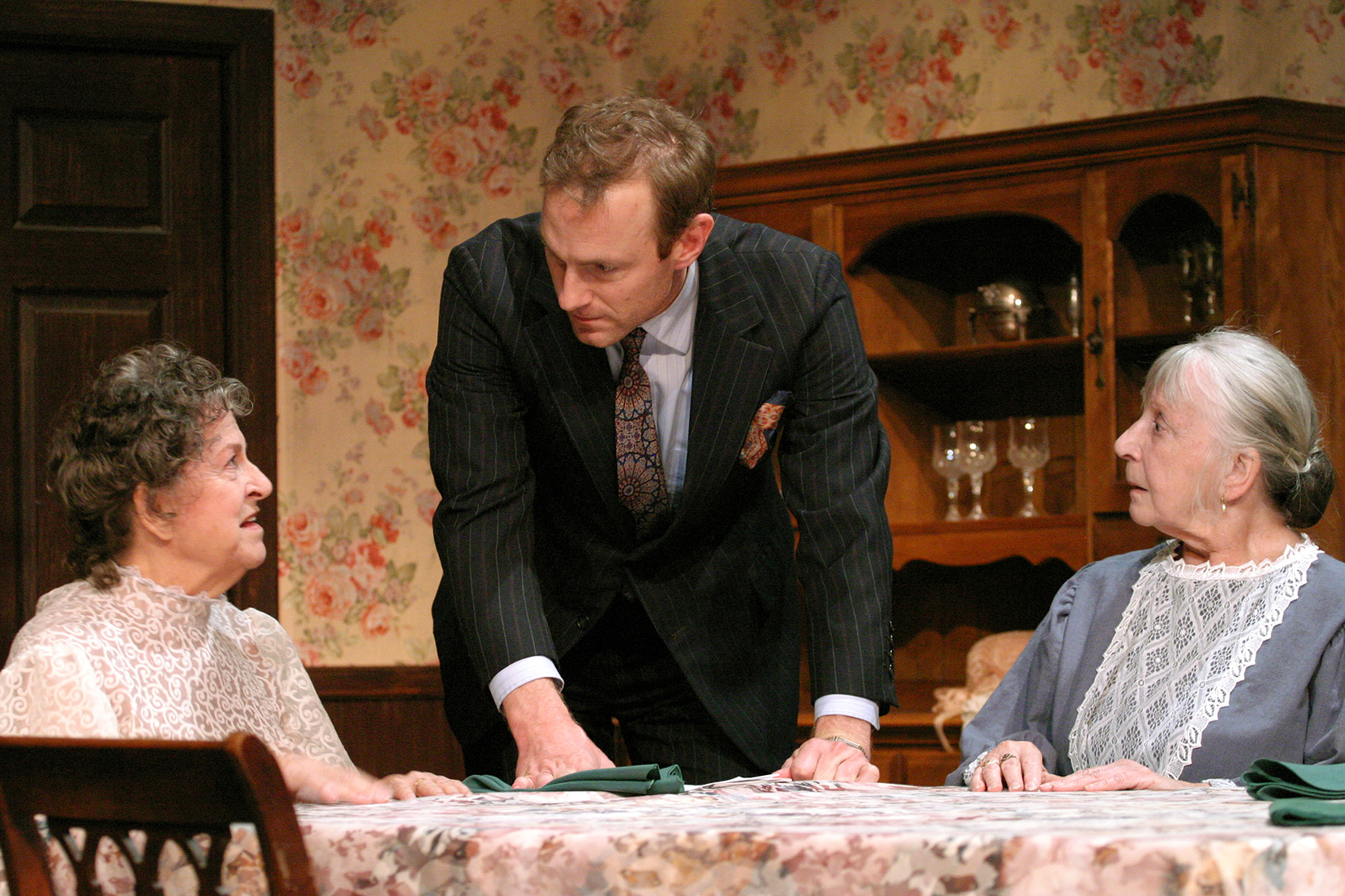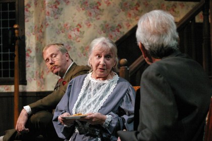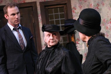 “It’s a terrible thing to do—to bury a good Methodist with a foreigner! (And we promised Mr. Hoskins a full Christian burial!)” Sheelagh Cullen as “Abby Brewster” and Jacque Lynn Colton as “Martha Brewster” complain to J.B. Waterman as nephew “Mortimer Brewster” that his brother “Jonathan” has the audacity to bury strangers in their basement , in “The Odyssey Theatre Ensemble’s Production of “Arsenic And Old Lace”