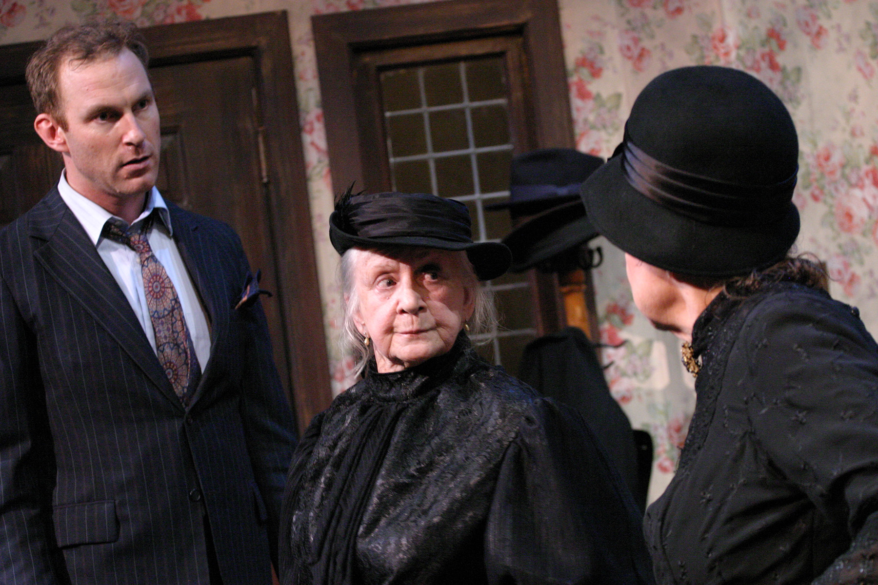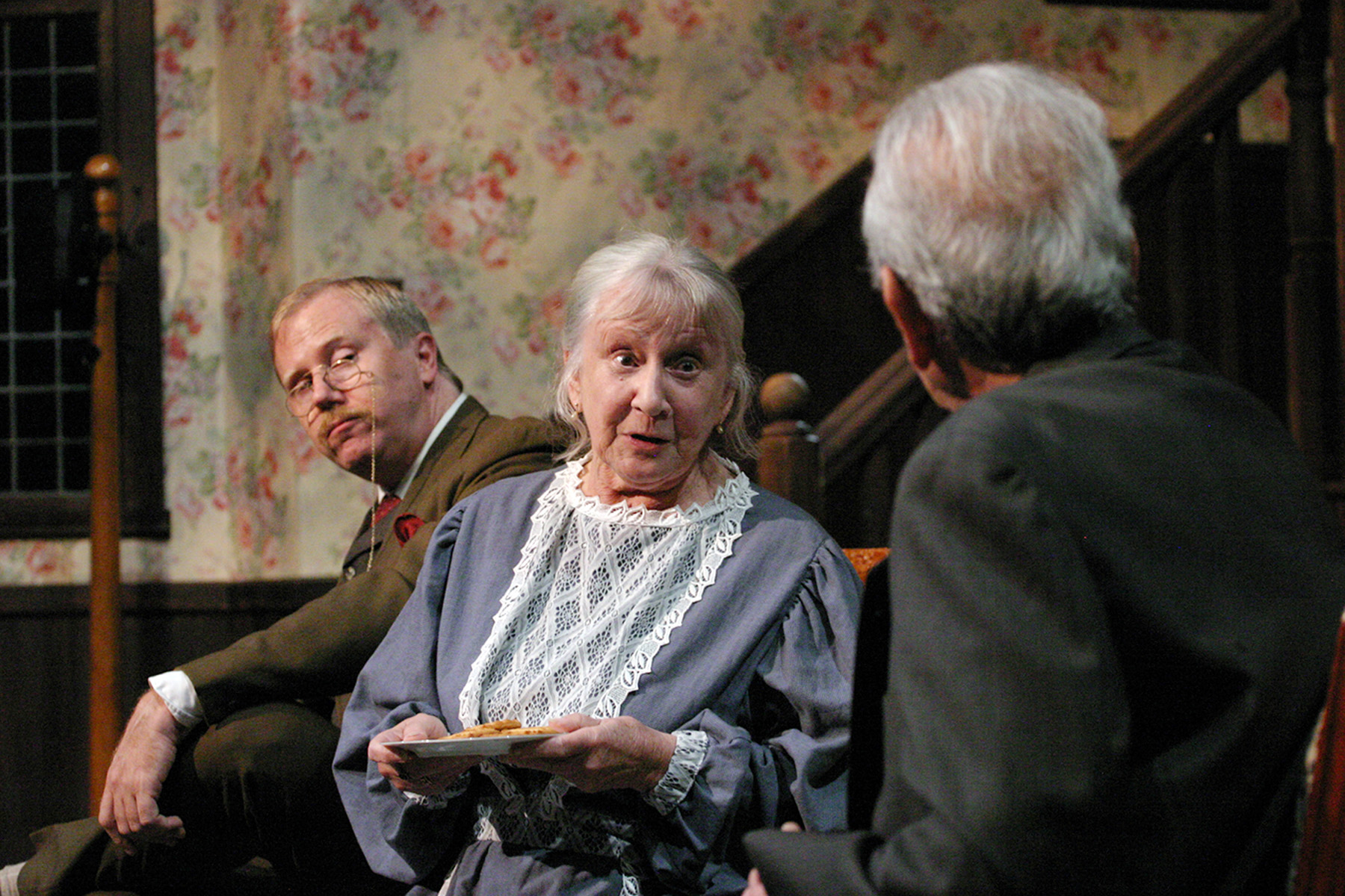 “Oh Mortimer, don’t be so inquisitive! The gentleman died because he drank some wine with poison in it…” J.B. Waterman as “Mortimer Brewster” is stunned by the admission that Jacque Lynn Colton (L) as his aunt “Martha” and Sheelagh Cullen ( R ) as his aunt “Abby” are so blithely confessing to him in “The Odyssey Theatre Ensemble’s Production of “Arsenic And Old Lace”